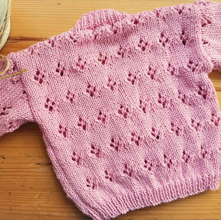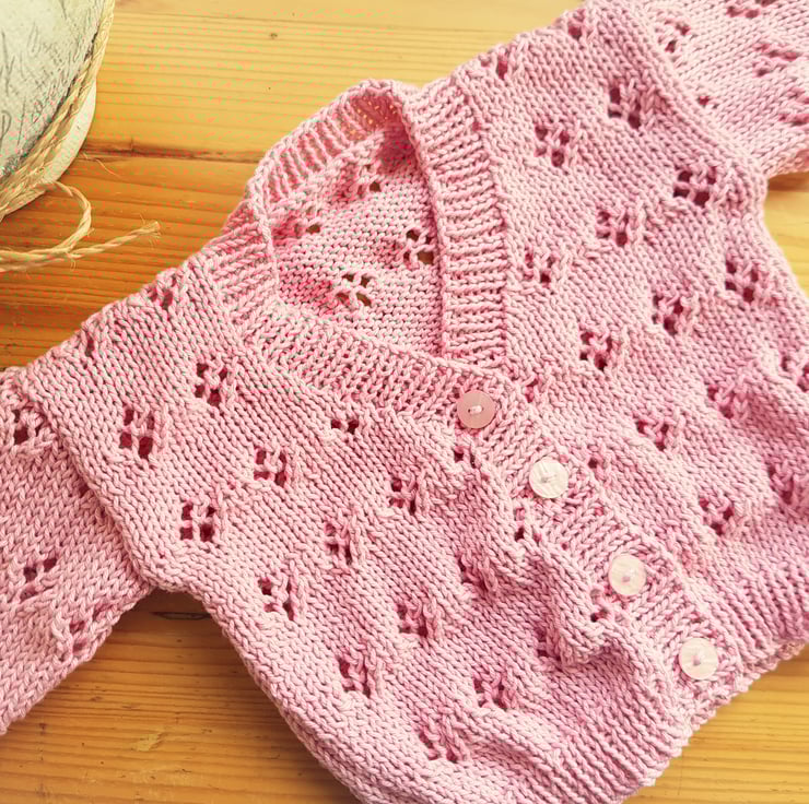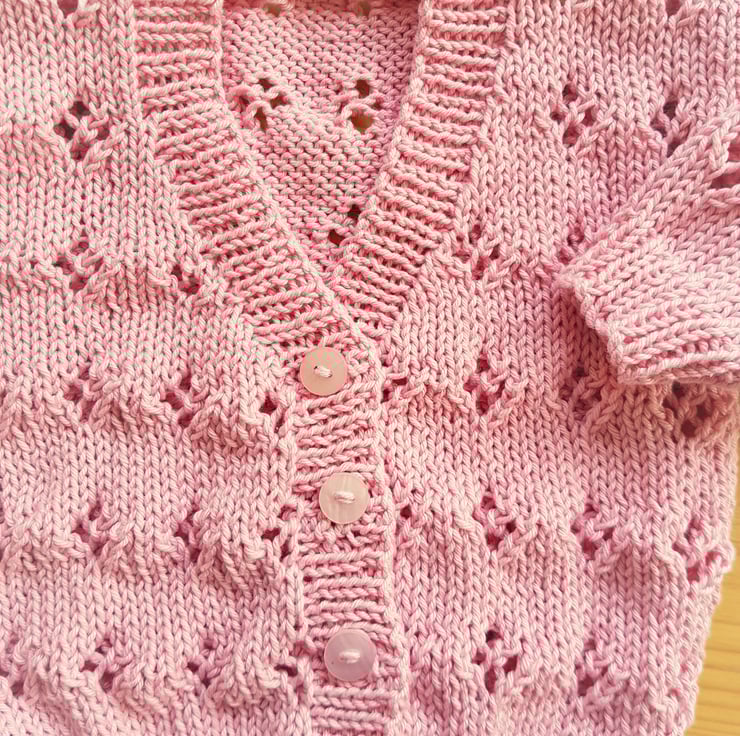 The eyelet pattern has been knitted throughout the garment, back front and sleeves. It has a 'v' neck and fastens with 4 matching pink buttons..