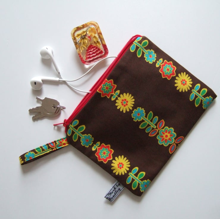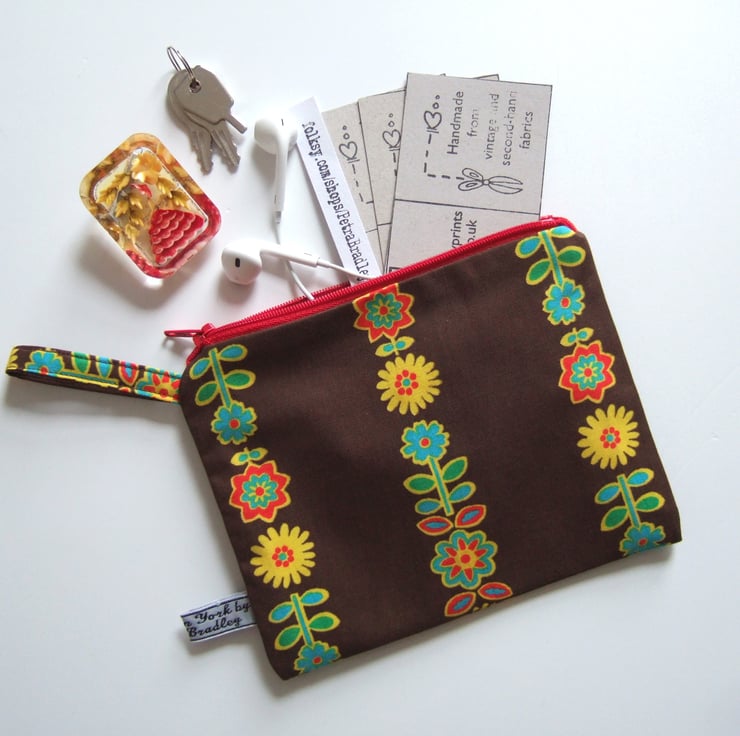 I have backed it with cotton for a bit of strength, but it is still soft. There is a bright red zip opening which measures 16 cm across, and the purse also measures 12 cm down. Inside, the lining is a strong mustard 1970s fabric which was given to me by a friend who collects old fabrics.