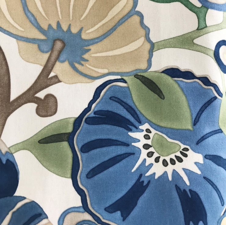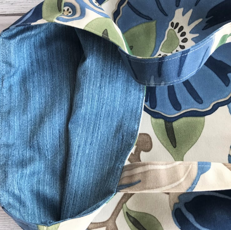 An attractive tote bag in a lovely bold floral print fabric. The pattern features large flowers in shades of blue and beige, with green foliage on a cream background. The bag is lined with blue fabric with slight sheen.