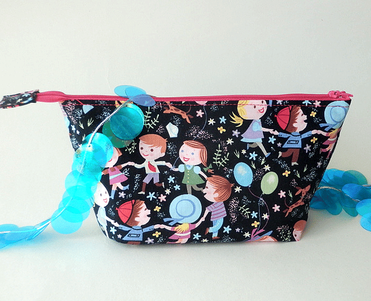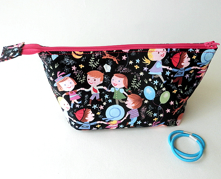 This is a pretty, zipped pouch, depicting children playing Ring-a-ring o’roses. The cotton fabric also has flowers, balloons and dogs. It is a colourful and happy design! Perhaps this would be a nice gift for someone with children or who works with children.