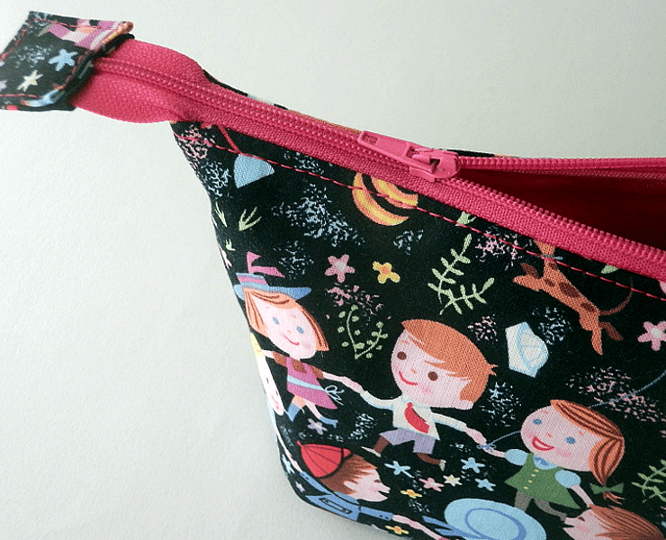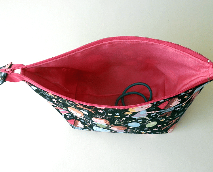 The exterior has been backed with interfacing so it can stand independently on its wide base. The closure is by a pink zip along the top.