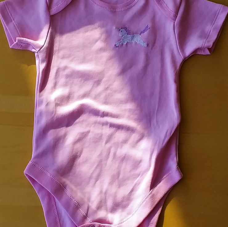 This is a very pretty baby pink vest/onesie I have made even more special by hand embroidering a white unicorn with a sparkly horn and lilac mane, tail and hooves on the front. The vest has an envelope neck, short sleeves and three press studs between the leg openings. It is 100% cotton and can be machine washed.
