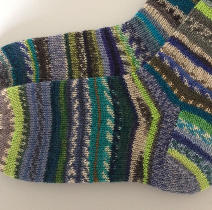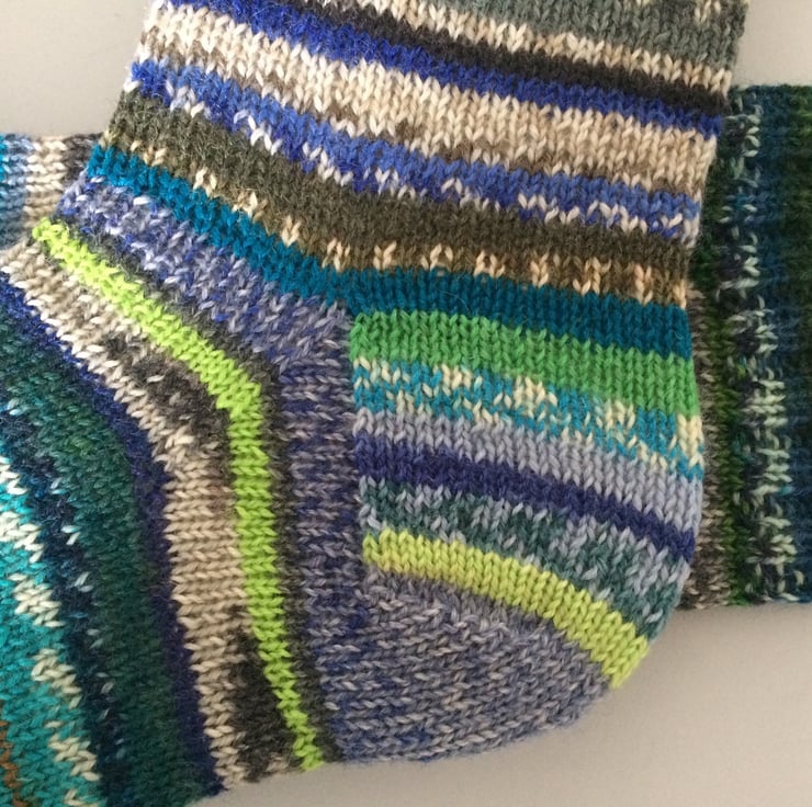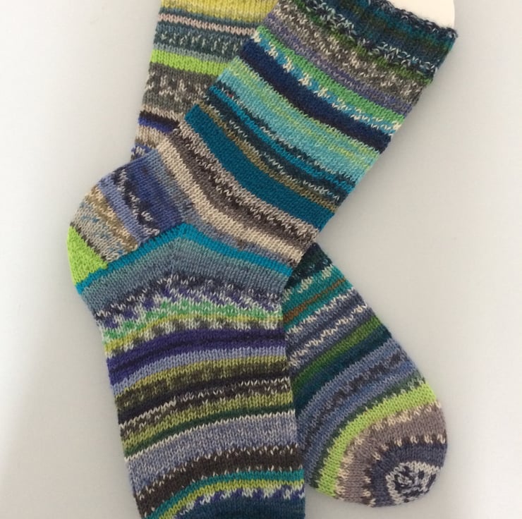 Hand knitted socks made from many different 4ply self patterning sock yarn, 75% wool 25% polyamide in shades mainly of blue, green and grey. Made from very fine yarn, they are not thick and will fit most footwear. Warm and durable, these socks will keep your feet comfortable and bright throughout the year. A truly unique pair of socks!