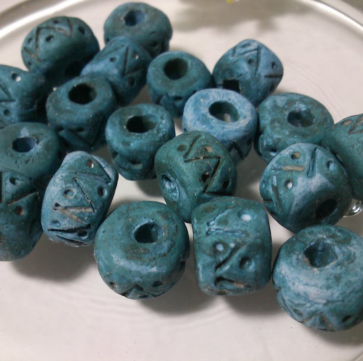Lovely indigo blue short tubular beads with tribal design. Made by me shaped out of earthenware clay.