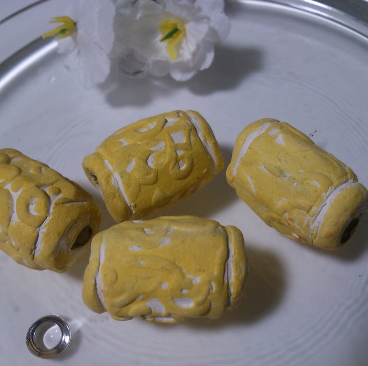 Large yellow ceramic textured beads. Ideal for leather or multi strand cord as central hole is over 3 mm.