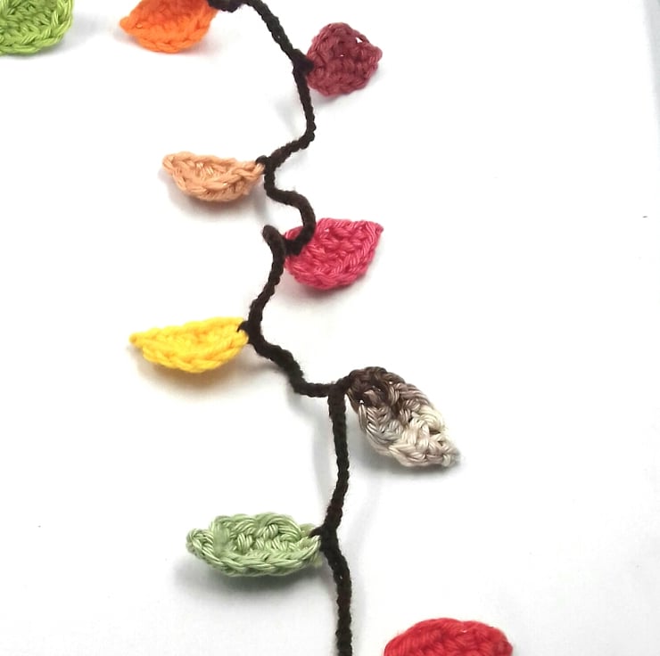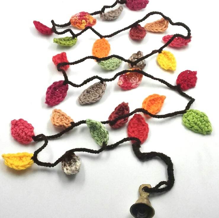 This pretty hanger is crocheted in 13 autumnal shades of cotton. There are 26 leaves tumbling from the hanging loop down the crochet brown woollen string. The brass bell at the bottom adds useful weight and a pleasing tinkle!