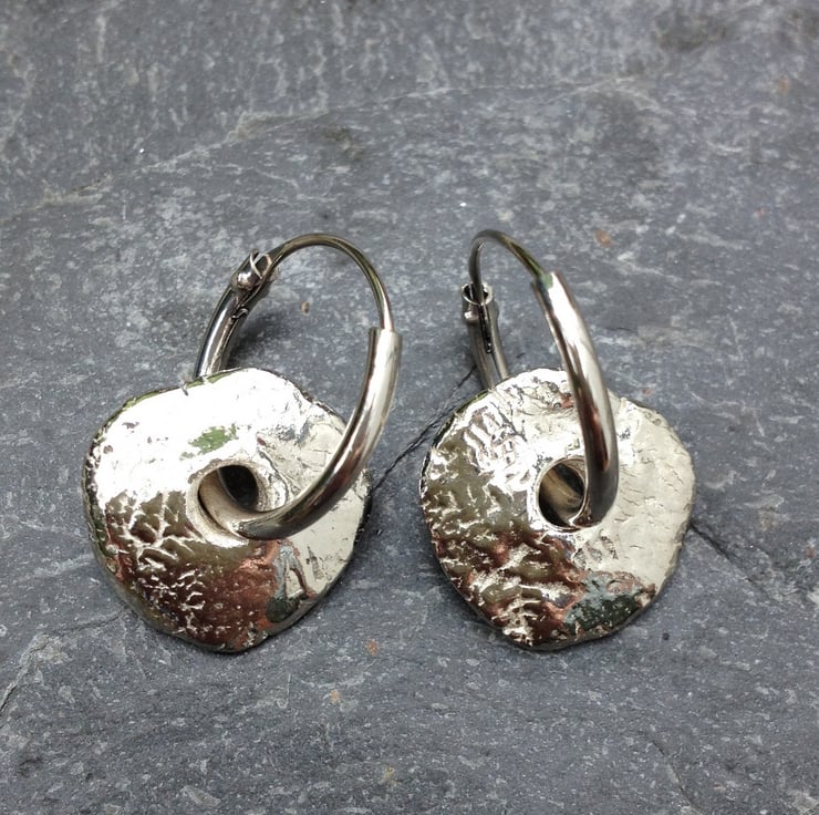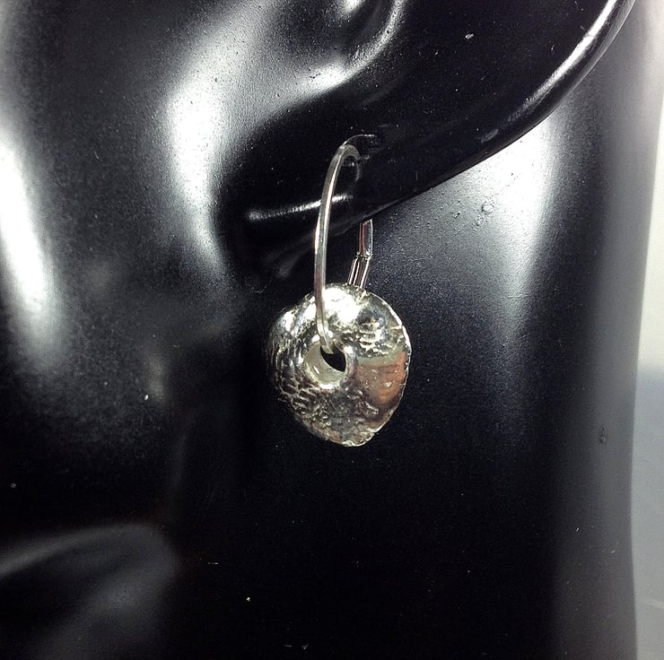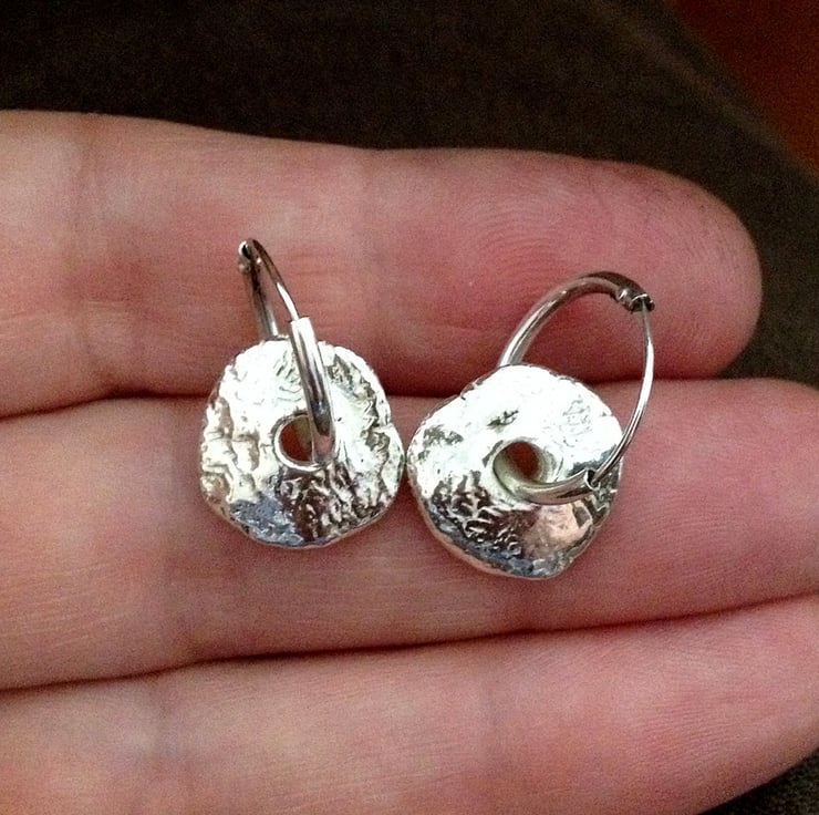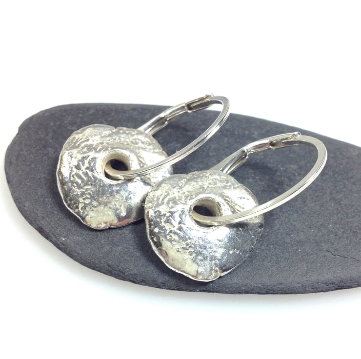 Weathered, textured rounds of sterling silver hang on silver hoops.