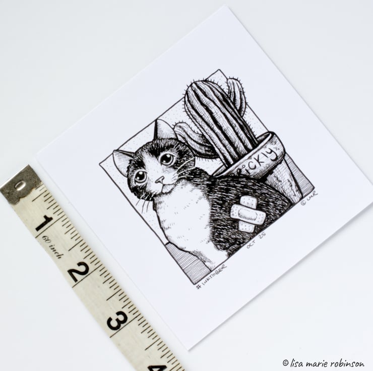 Drawing of a black & white cat sitting next to a potted cactus. This kitty got a little too close as he's sporting a plaster/bandage.