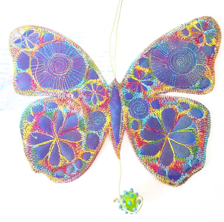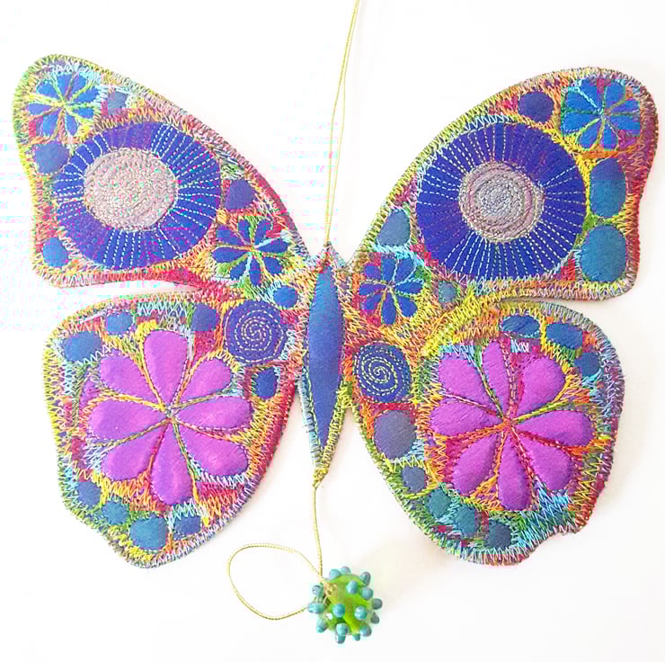 This is a handmade machine stitched fabric hanging butterfly decoration.