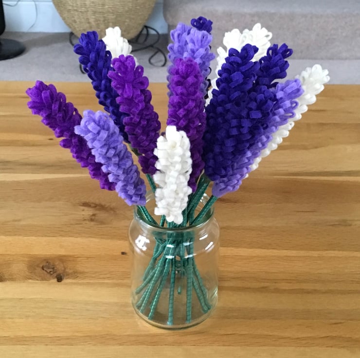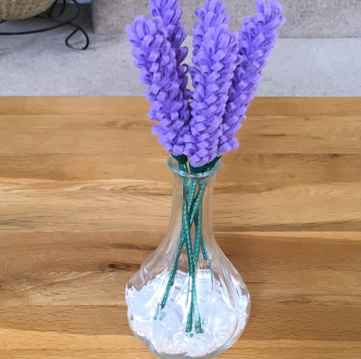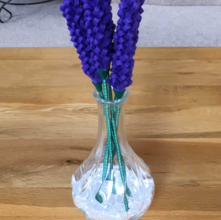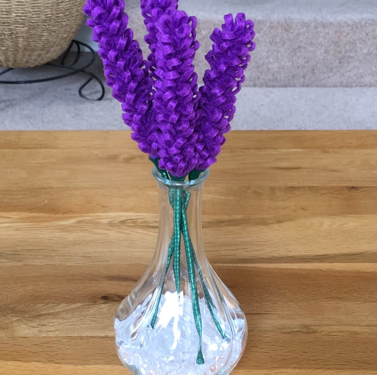 These lovely lavender wands which are made from felt make a lovely table decoration. Each one has been made from the appropriate coloured Felt and attached to a ribbon covered skewer. The measurements are 26cm approximately in length. They can be bought as a single stem or a bunch of your preferred choice and as a mixture of colours. The colours consist of Purple, Lilac, Cream and dark Purple. Custom orders can be taken. The price below is for one single stem, a price will be given for a bunch on request.