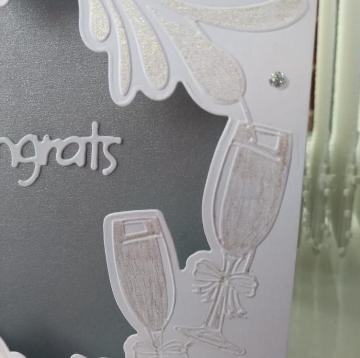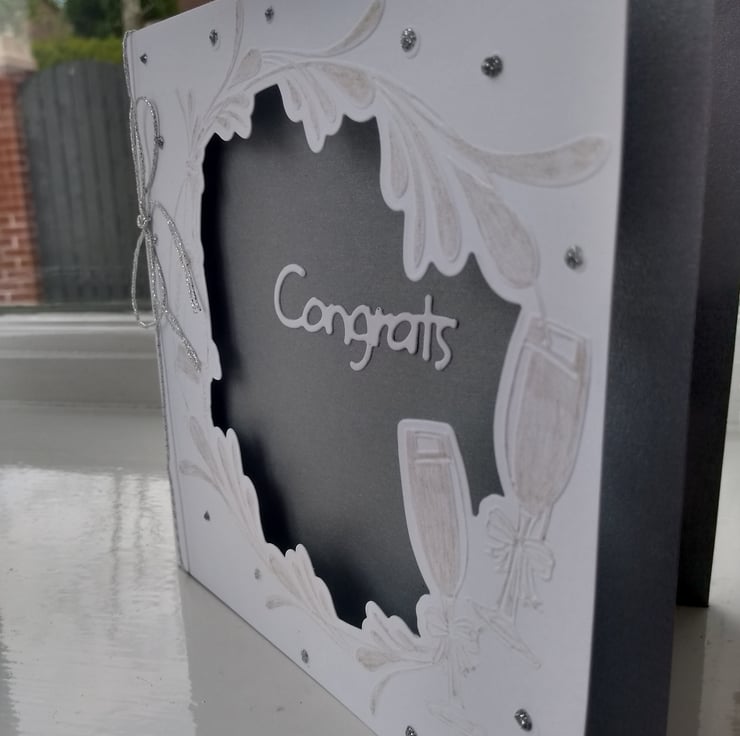 A completely handmade and uniquely designed card. Consisting of quality pristine white y which had a pretty design of champagne, glasses and splashes die cut leaving a space in the centre to allow the insert paper to show through. In this is a die cut congrats mounted. Bubbles have been glittered. Finished off with silver cord. Silver highlights.