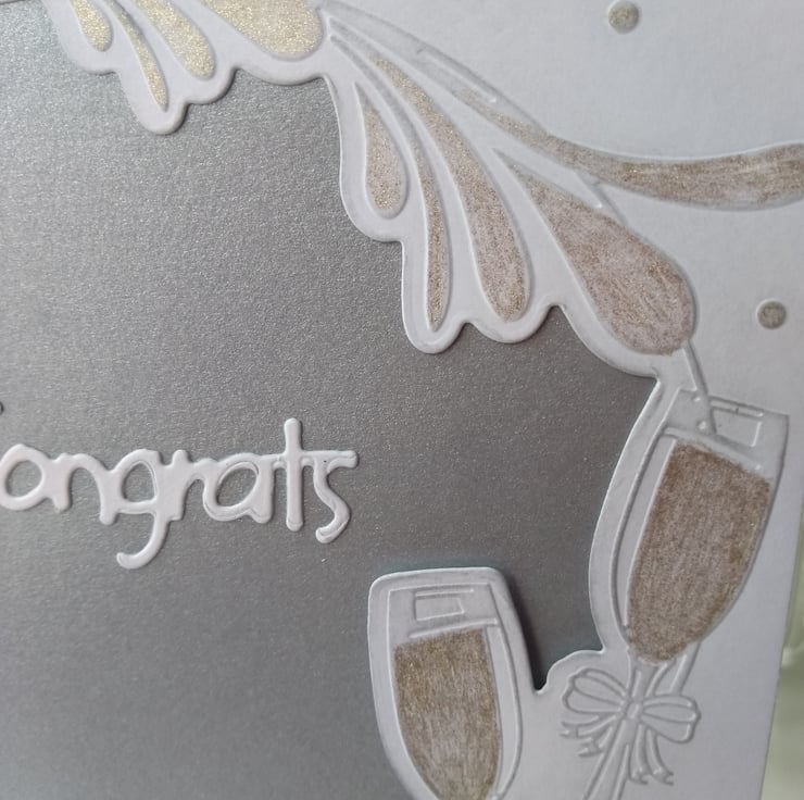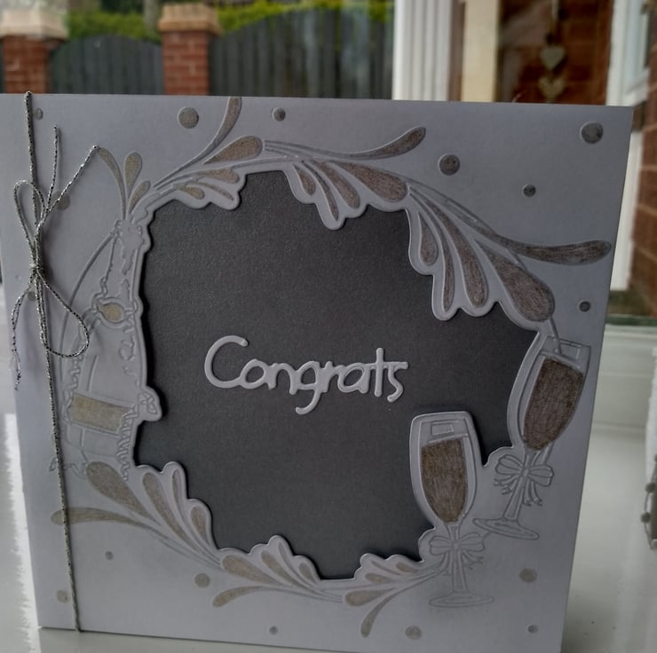 A completely handmade and uniquely designed card. Consisting of quality pristine white card which has been die cut and embossed with champagne. Glasses and splashes and bubbles. Leaving a centre space to Allie the insert paper to show through. Highlit in silver. Congrats die cut from white card and mounted on silver paper. Finished off with silver twine.