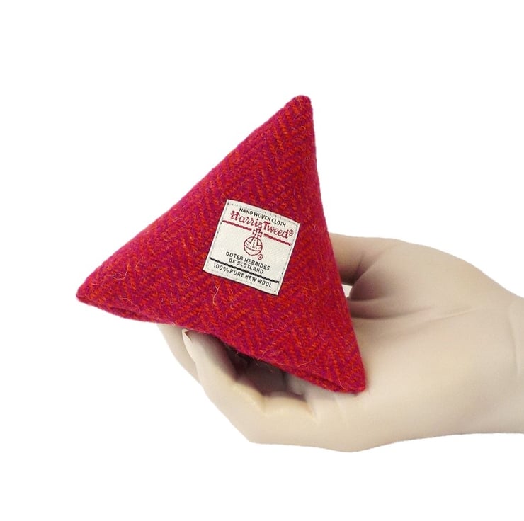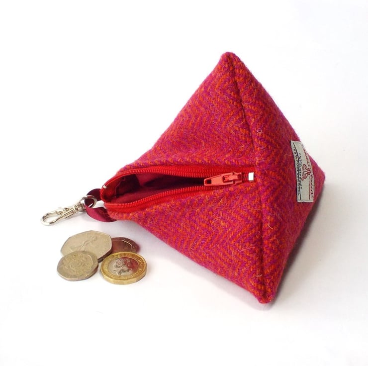 Totally different - a pyramid shaped purse hand-made from Harris tweed! This little purse measures 10cm each side. It features a zipper close up one side, and a handy little clasp on the top to clip the purse onto your bag or belt loop.