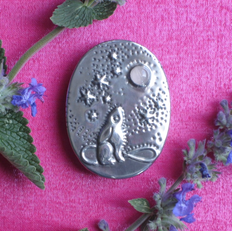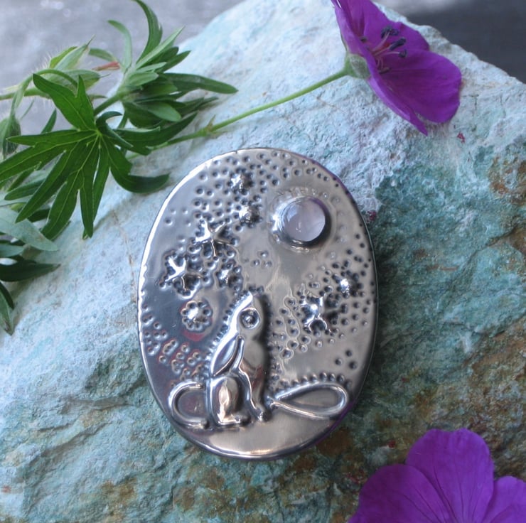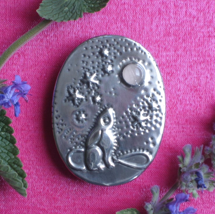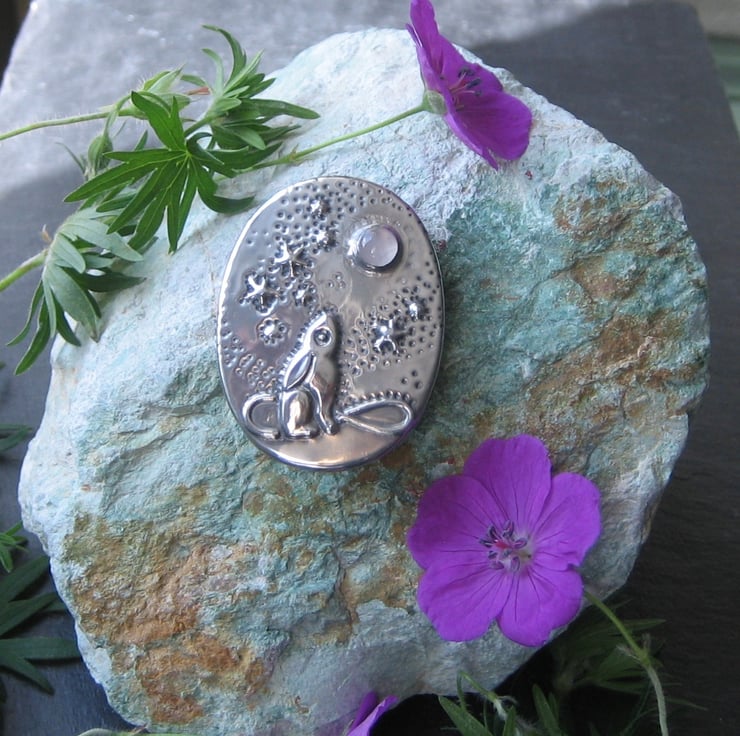 Moongazing hare oval brooch handmade in shiny lead-free pewter, set with a genuine pale pink rose quartz cabochon.