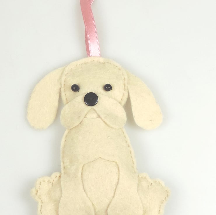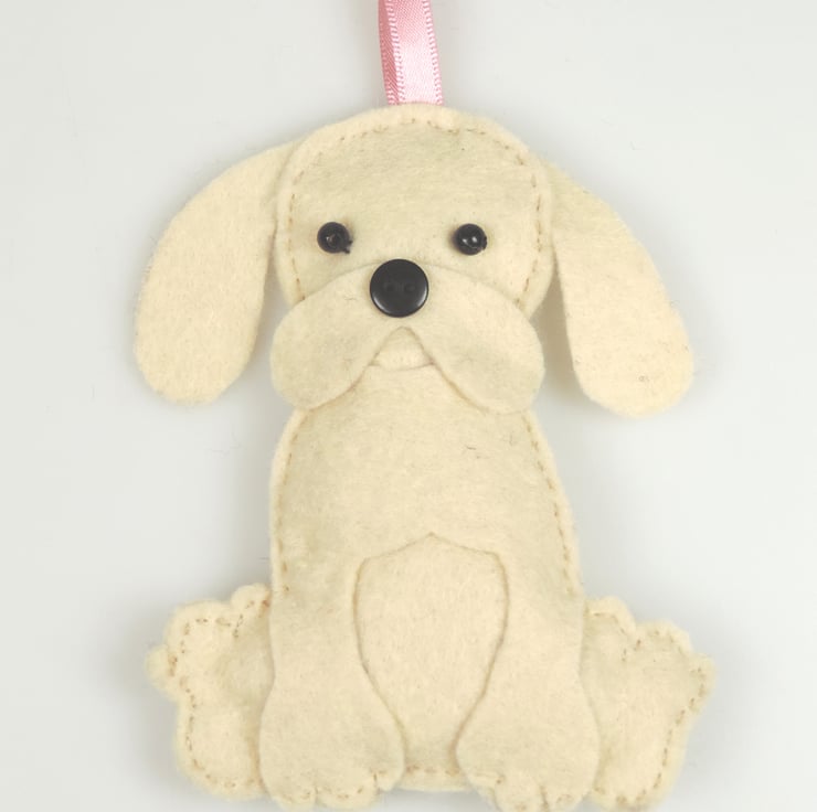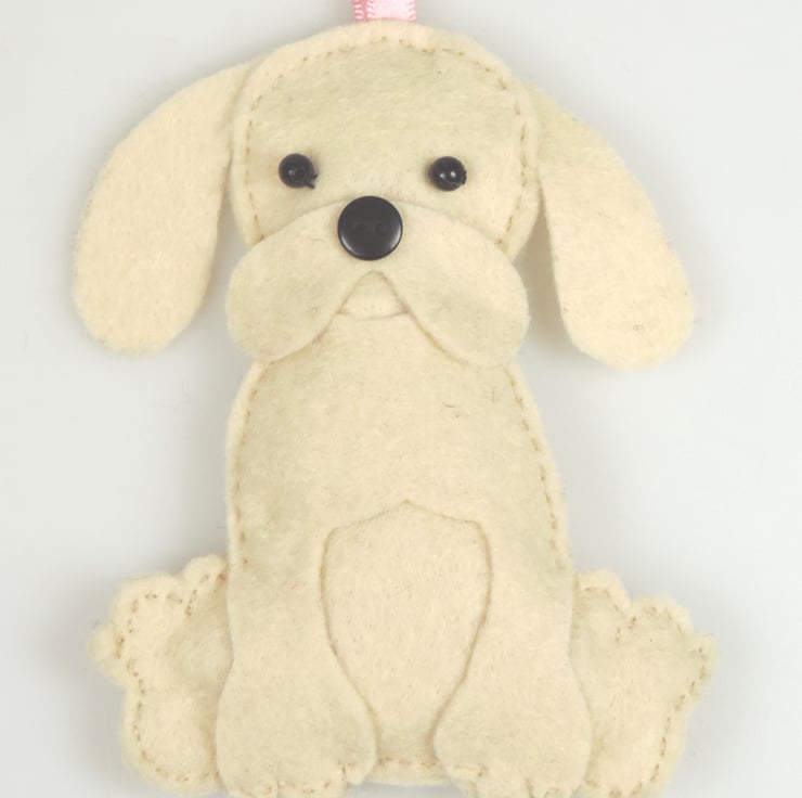 Handmade felt seated puppy dog hanging decoration, handmade with bead eyes and a button nose. Golden blonde coloured Labrador puppy dog.