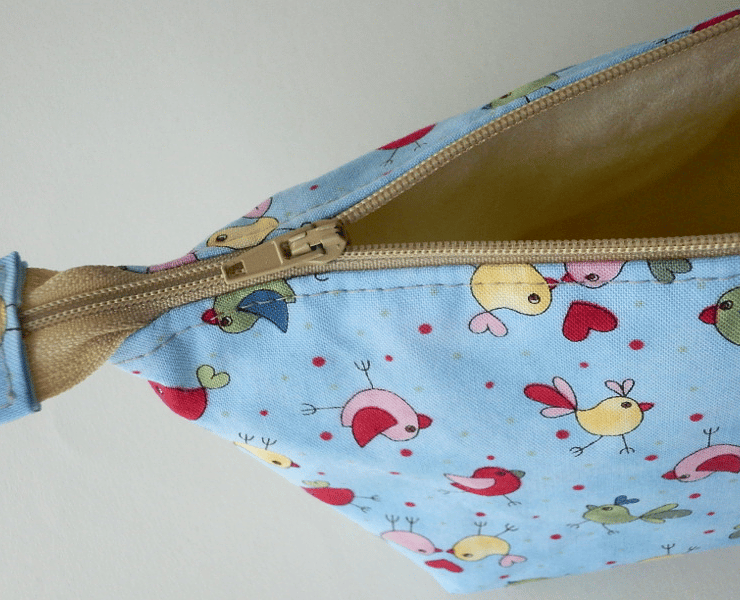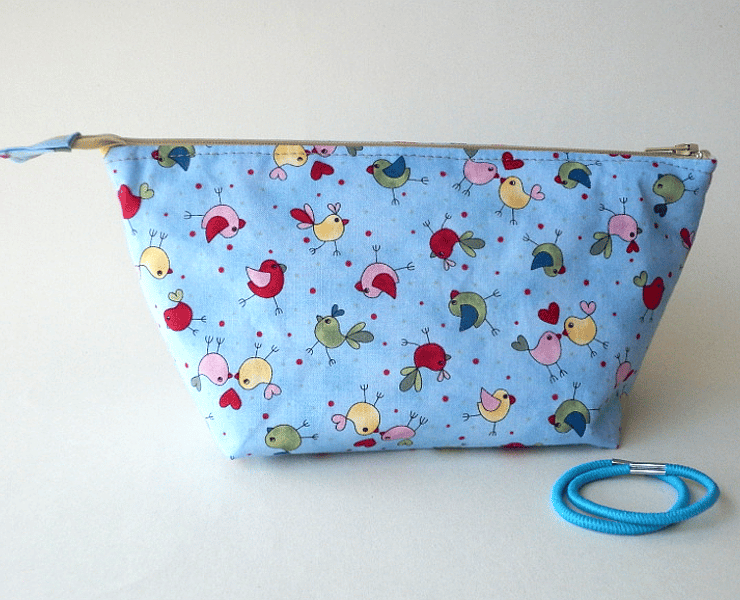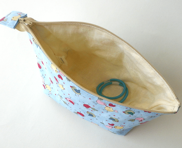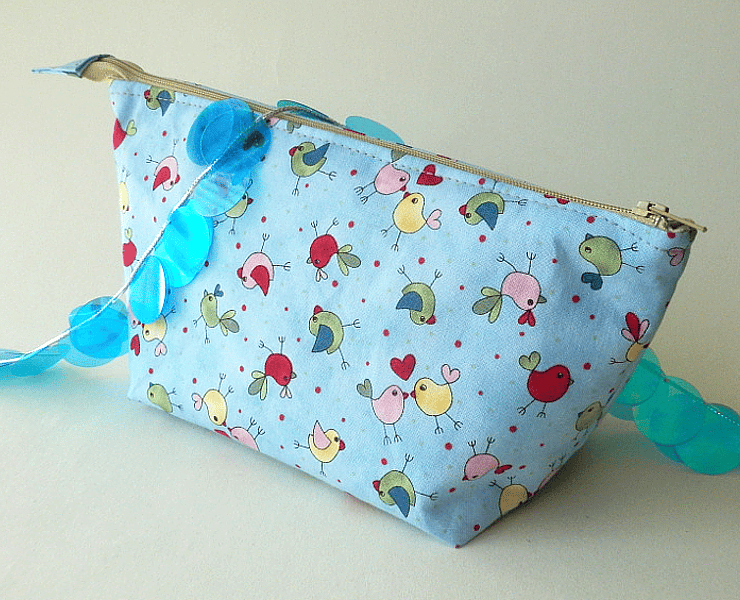 This is a pretty, zipped pouch, made with a fun cotton fabric with colourful cartoon-like birds on. Some of the birds are in pairs and having a kiss, with a little red heart above them. This would be a lovely gift for a bird lover or perhaps for your loved one.