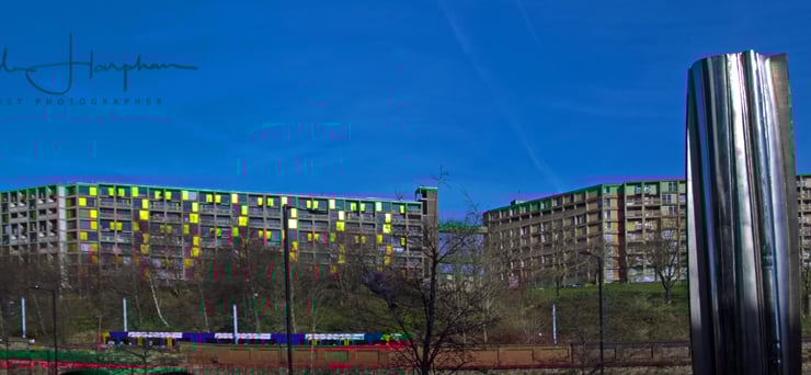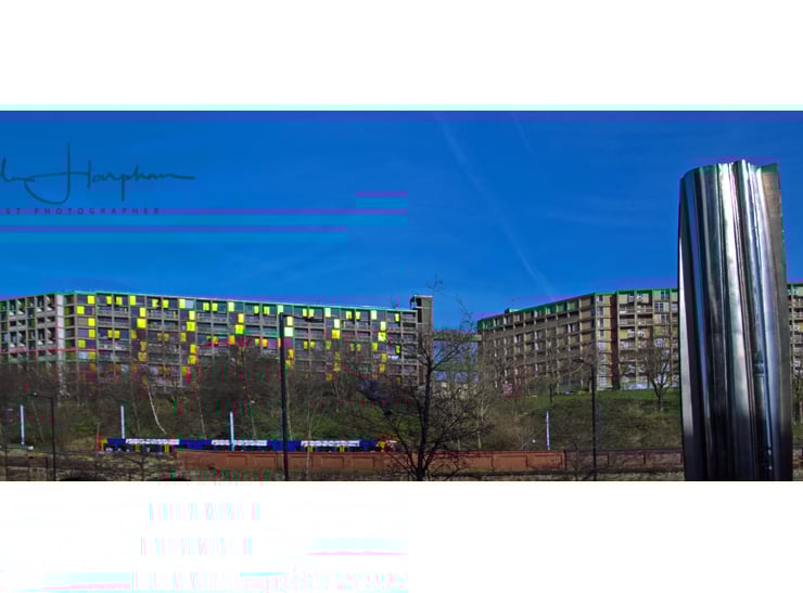 I liked the contrast between the two different phases in the life of the flats and the modern stainless steel sculpture, Sheffield is famous for stainless steel where the process was invented and developed. And I was lucky to capture Supertram too