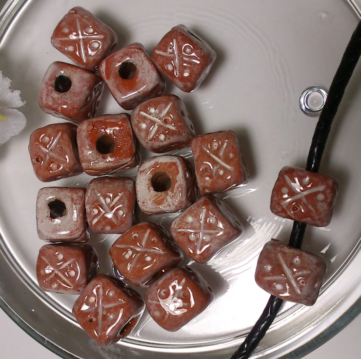 Teracotta white pattered clay square beads with large central hole large enough for 3 mm leather or multi strand cords.