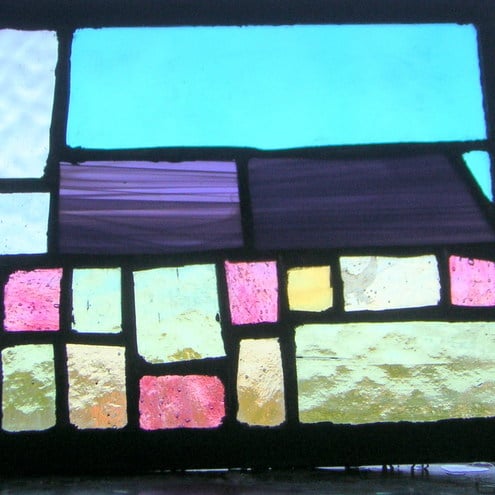 Inspired by the tiny wind battered churches of Dartmoor villages, this is part of my current Dartmoor Series, created from sketches I made in the recent glorious weather after visiting the moors. This panel is made using the copper foil and traditional leading techniques and is 16.5 X 20 cm.