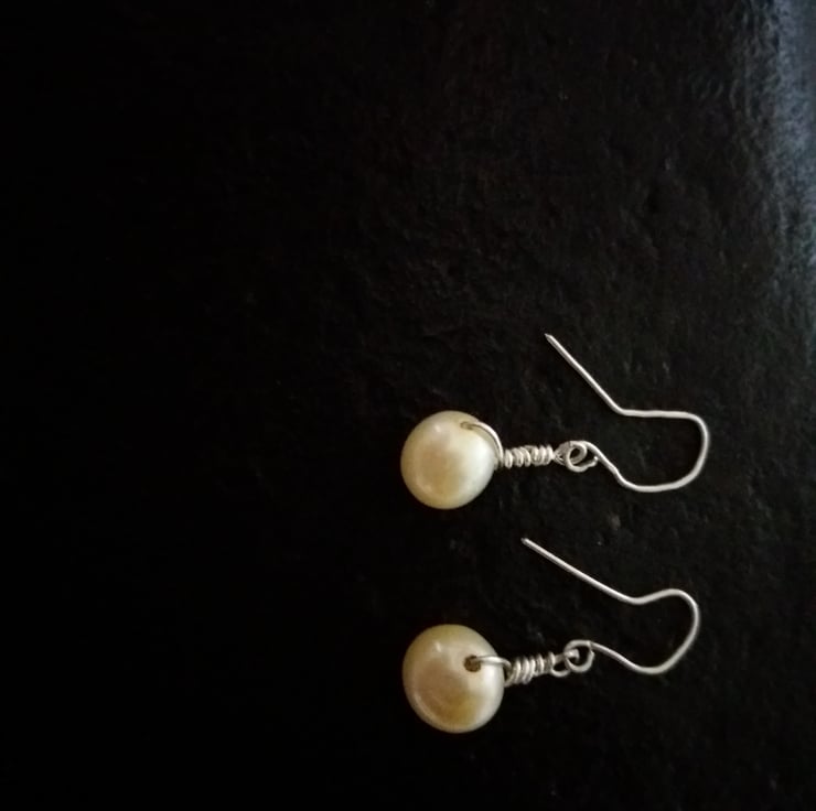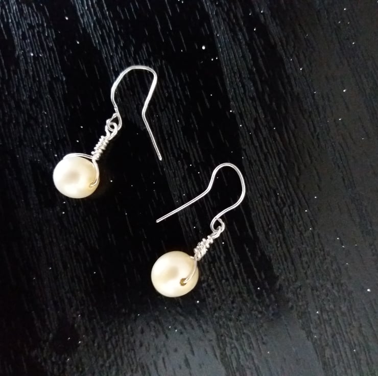 Dainty ivory freshwater pearls hung from delicate handcrafted fine silver earring wires. The pearls are 8mm in diameter and have a 1.4cm drop from the earrwires. The overall drop is 2.5cm from the top of the earwires.