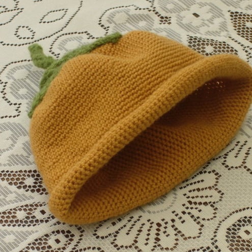 The hat is made to fit a baby aged 3-9 months and measures approximately 19.5 inches in circumference and approximately 6.5 inches from the base of the stalk to the bottom of the rolled-up edge.