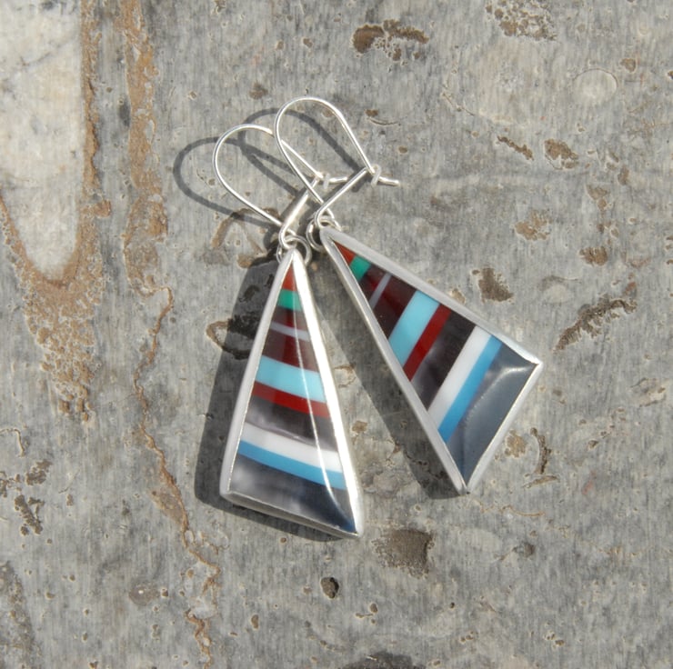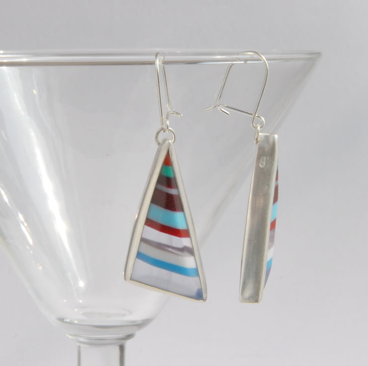 These stripey drop earrings features colourful surfite which has been bezel set in sterling silver and they have been completed with safety hooks (also sterling silver). The surfite has vibrant bands in shades of pale blue, white, red and translucent with a hint of blue, they remind me of the sails on boats. The earrings are open backed to allow light to pass through the translucent bands and have been given a matte finish rather than a high shine. Safety hooks have an extra arm at the back for the hook to fit into, this means they cannot be knocked out of your ears by scarves or if they become tangled in your hair.