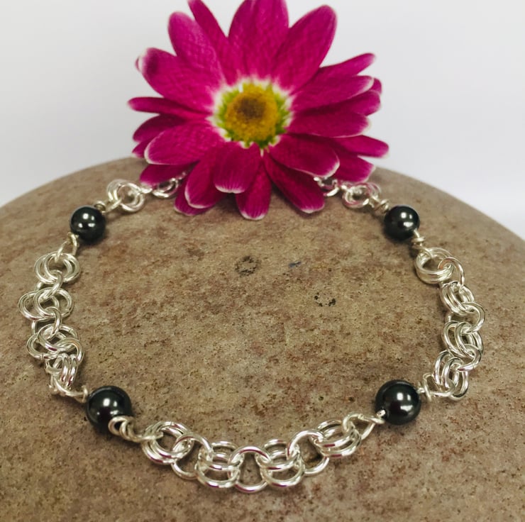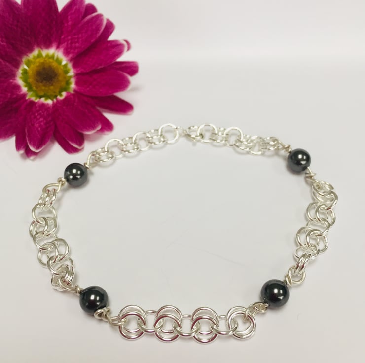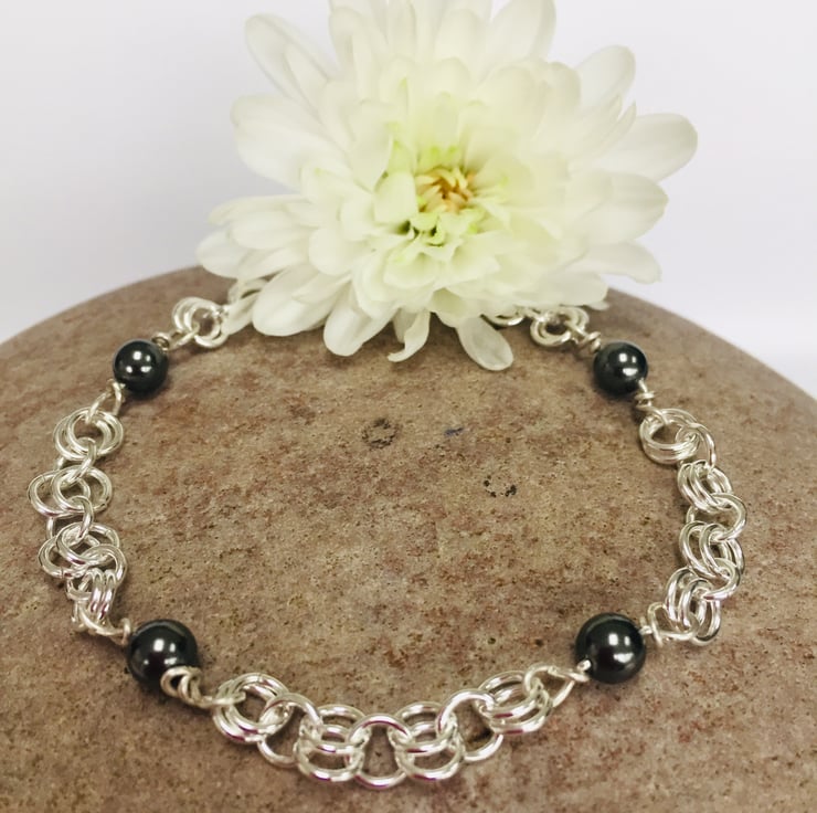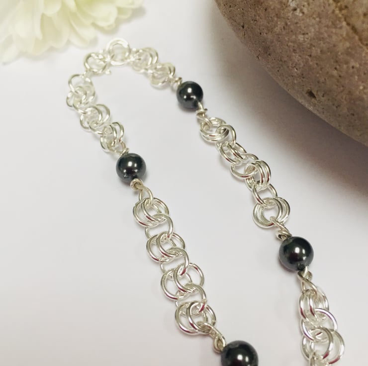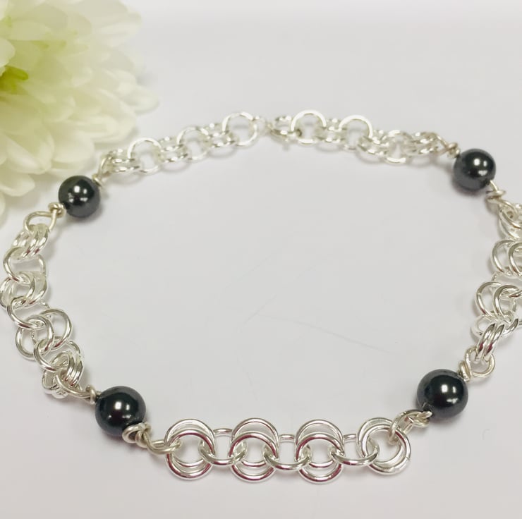 This bracelet is made from sterling silver chain links with black Swarovski pearl beads. It is finished with a sterling silver bolt ring clasp.
