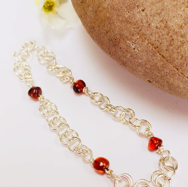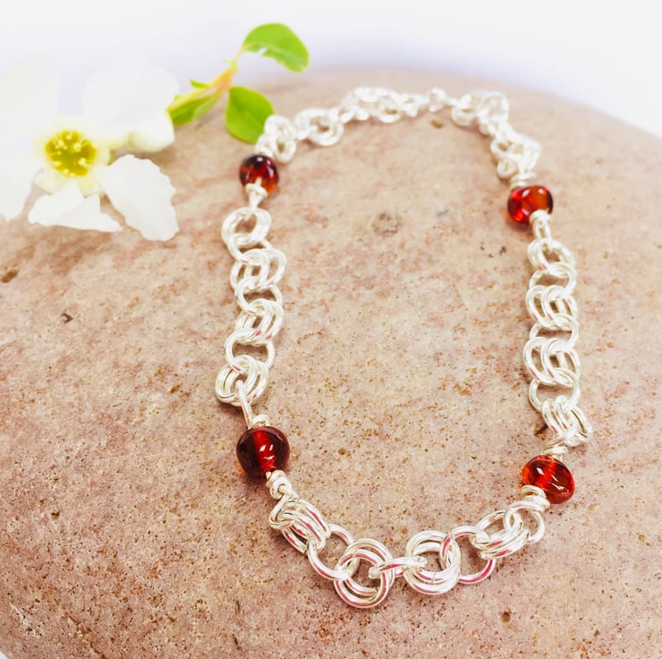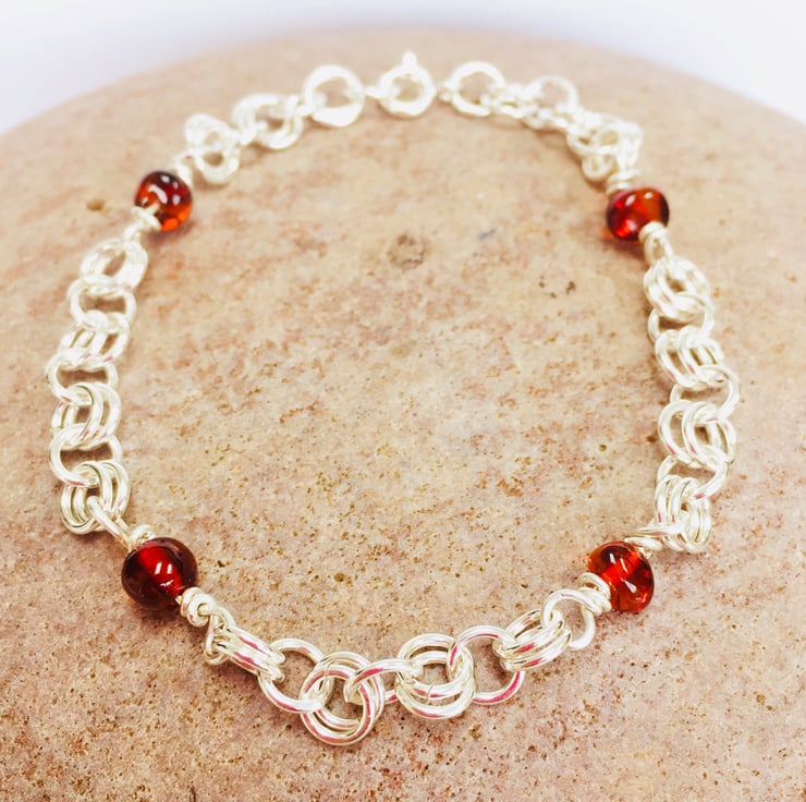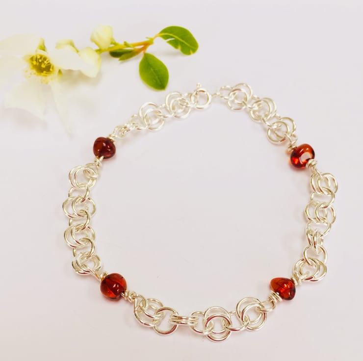 This bracelet is made from sterling silver chain links with gorgeous amber beads. It is finished with a sterling silver bolt ring clasp.