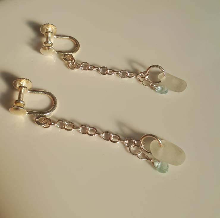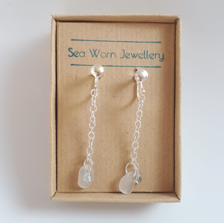 Milky white genuine UK sea glass with a snall pale blue briolette on a sterling silver chain. Attached to silver plated screw earrings.
