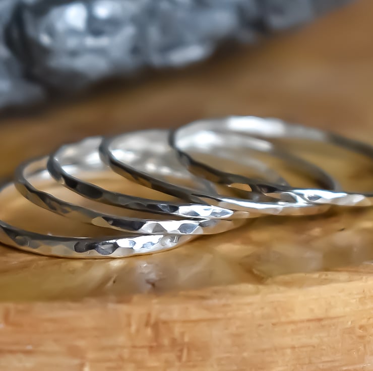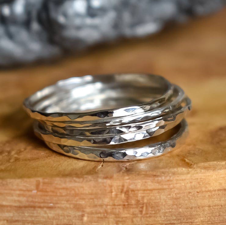 Handmade set of 5 brightly polished & hammered .935 Silver rings.