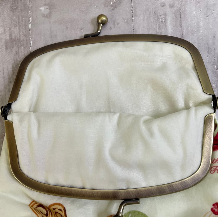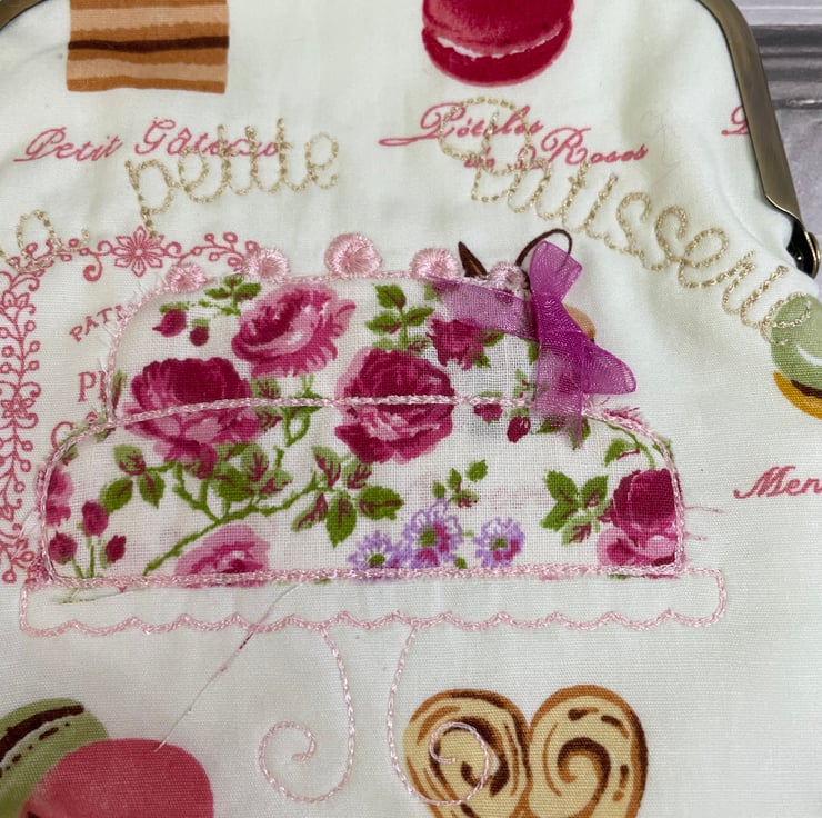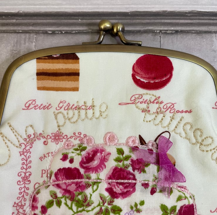 A little frame clutch bag is so pretty, made in an ivory macaron and gateaux print fabric, with a rose decorated cake on a stand appliqued on the front. With the words Ma Petite Patisserie (My Little Patisserie). fully lined with plain cotton fabric.