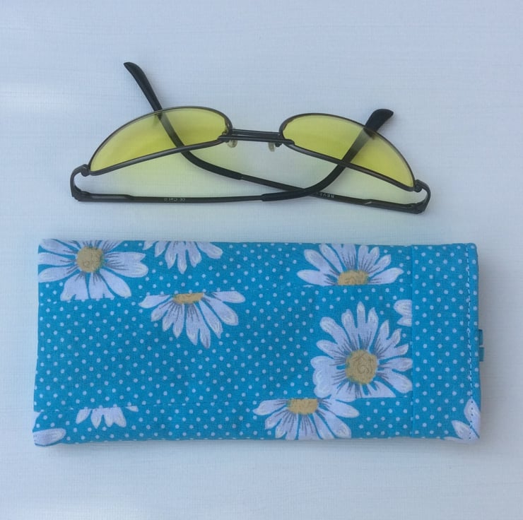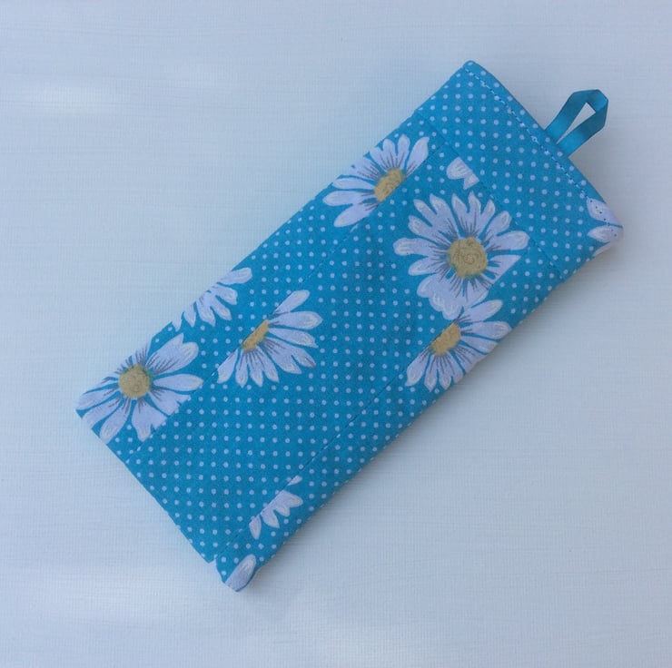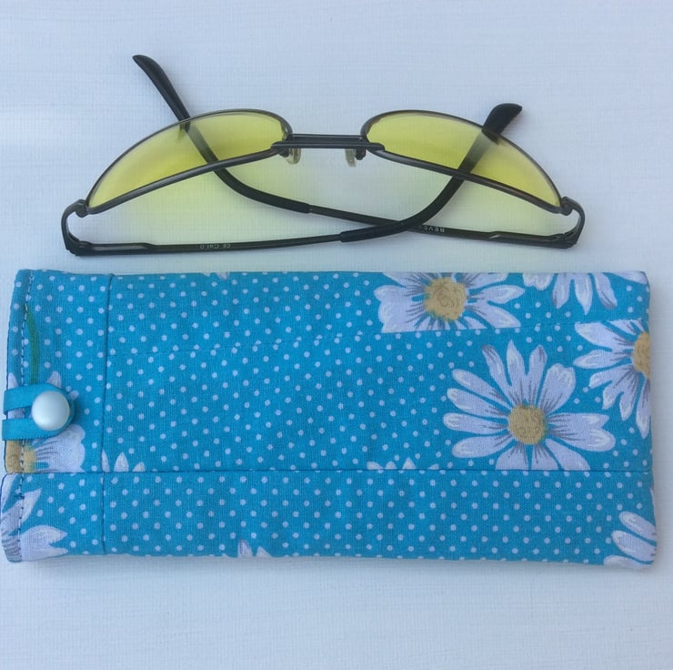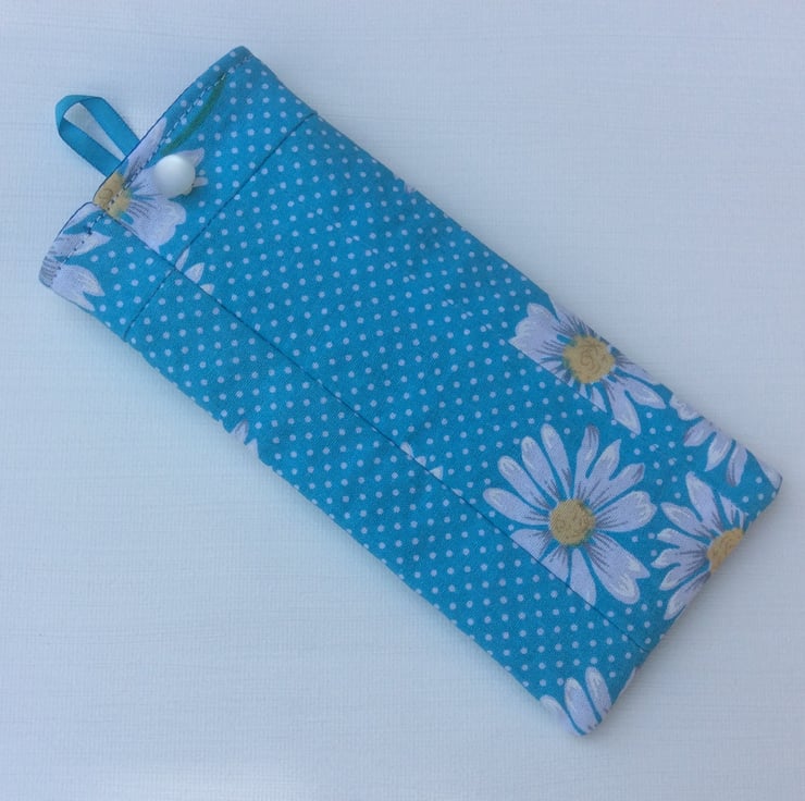 This glasses case is a one off and would be exclusive to you! The case is made from a panel of patchwork. The fabric is turquoise cotton with white daisies and small white dots. It is lined with a darker turquoise satin and interlined with a layer of felt. The case measures approximately 16.5cm x 7.5cm and there is turquoise ribbon loop and white button closure.