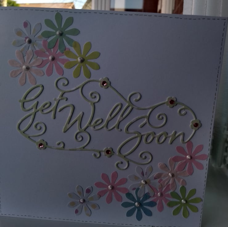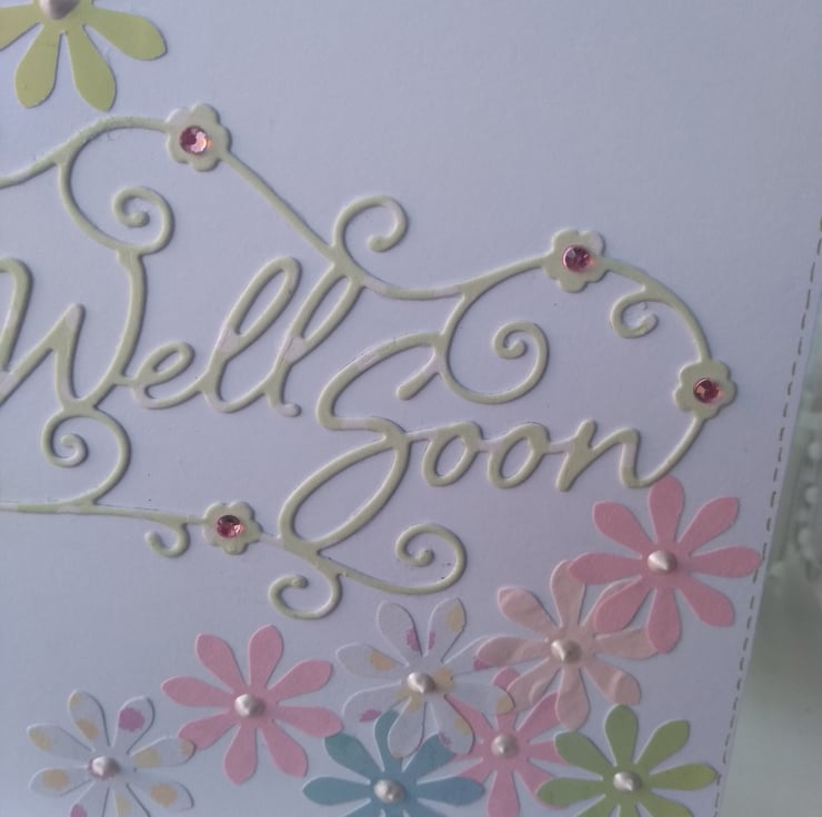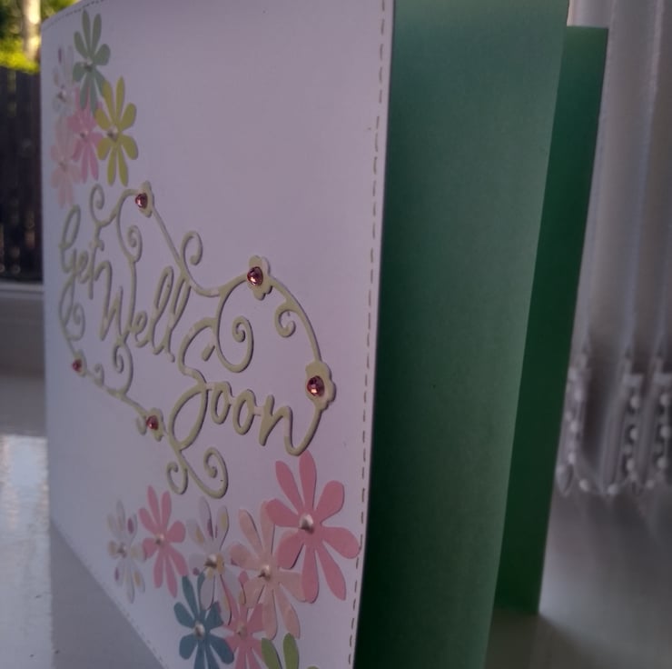 A completely handmade and uniquely designed card. Consisting of get well soon die cut from green card mounted onto pristine white quality card. Embellished with co ordinating flowers with liquid pearl centres. Finished off with pink rhinestones