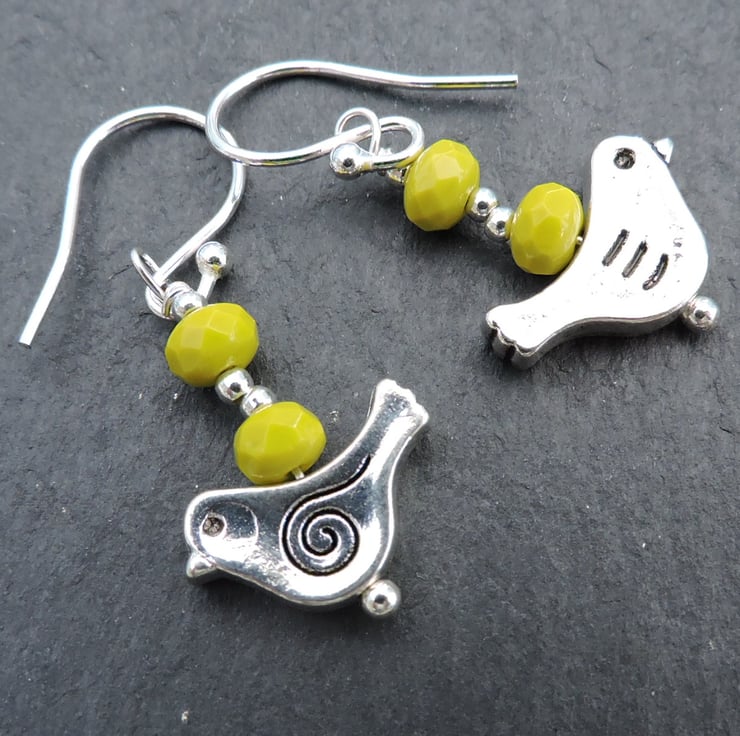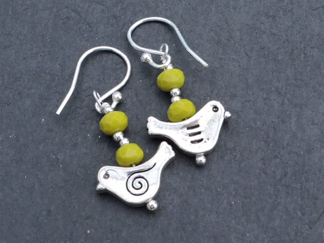 A cute pair of drop earrings made with little lime faceted rondelle beads, silver plated spacer beads and a little tibetan silver bird . Silver ear wires.
