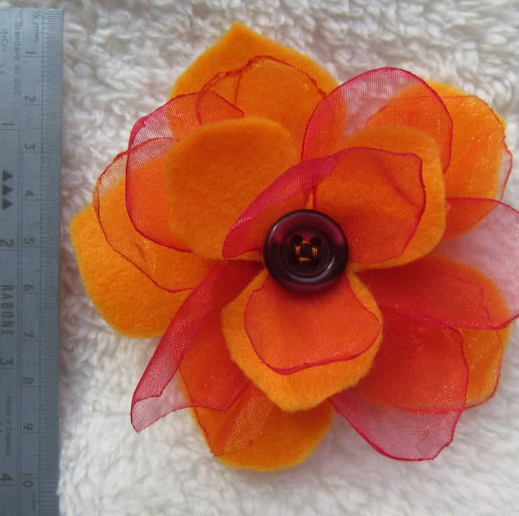 This flower brooch is made up of two layers of orange acrylic felt and three layers of organza in orange and red, which has been singed with a candle to stop the edges fraying.