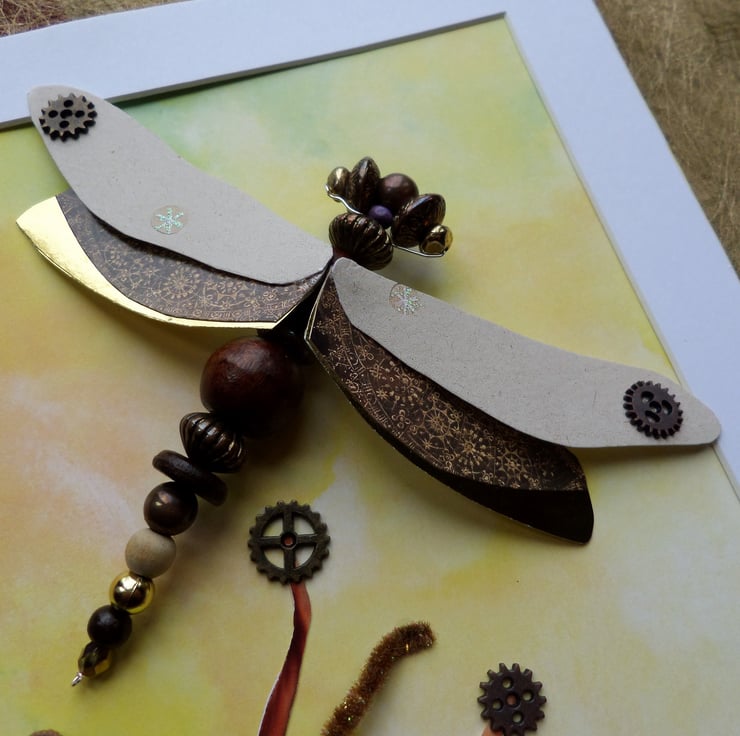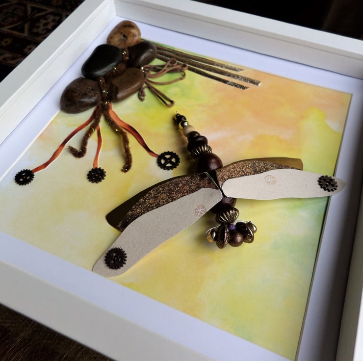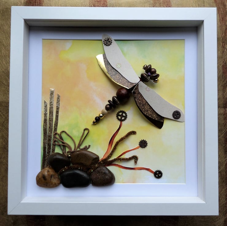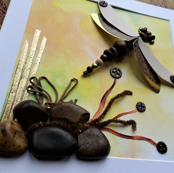 I have used pebbles, cotton cord, chenille, card and cogs to create the dragonfly's mini environment, all mounted on a printed watercolour-effect background in yellows and greens.