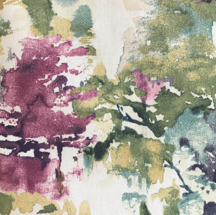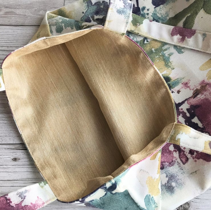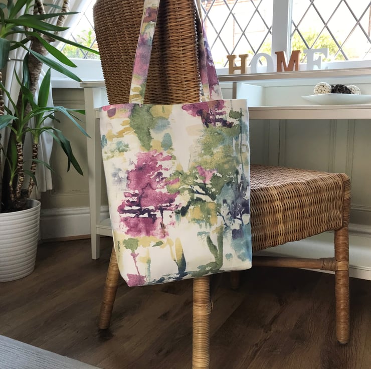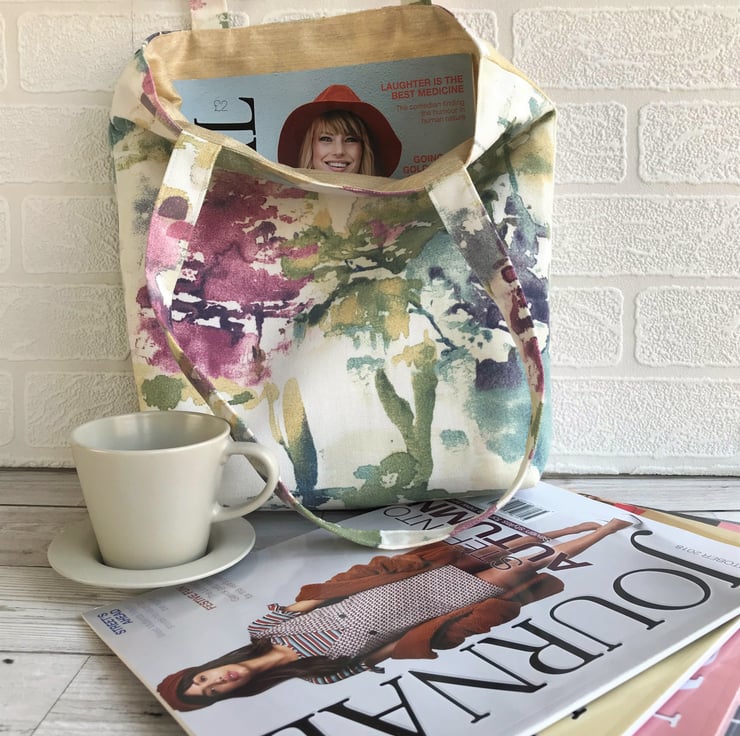 A useful tote bag in an attractive print fabric featuring an abstract pattern of patches and splashes of colour on a pale cream background. The pattern features shades of blue, green, deep pink and creamy yellow, along with hints of purple. The bag is lined with a creamy beige fabric with a slight sheen.