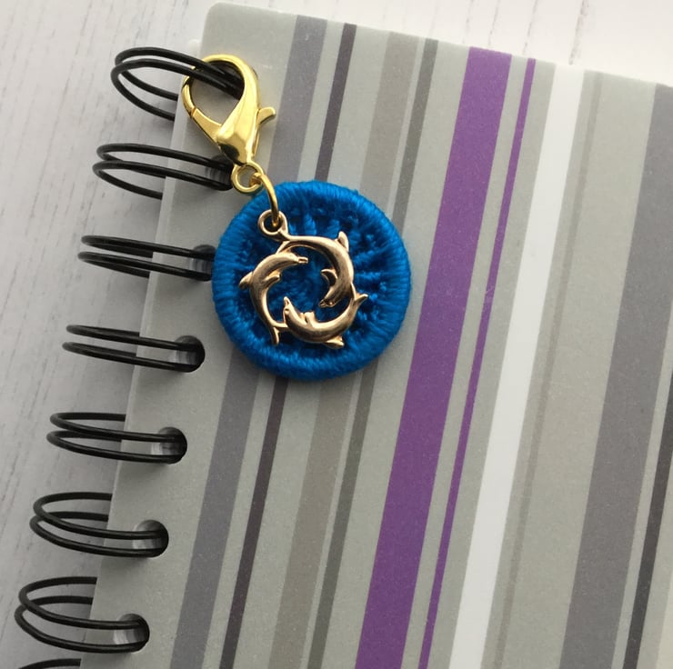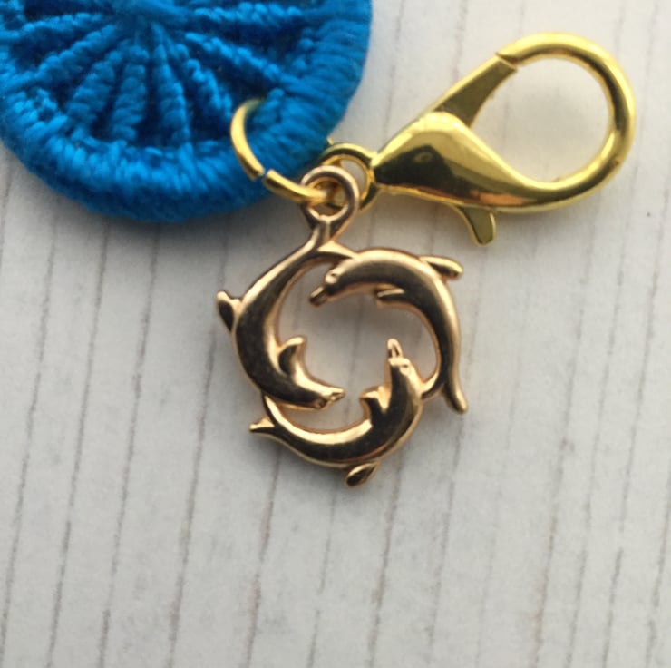 The button is fastened together with a beautiful circle of dolphins charm in a gold coloured metal onto a gold coloured lobster claw catch, it can easily be attached to a zipper pull, bag or spiral binding.