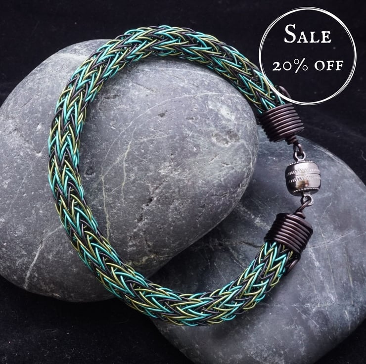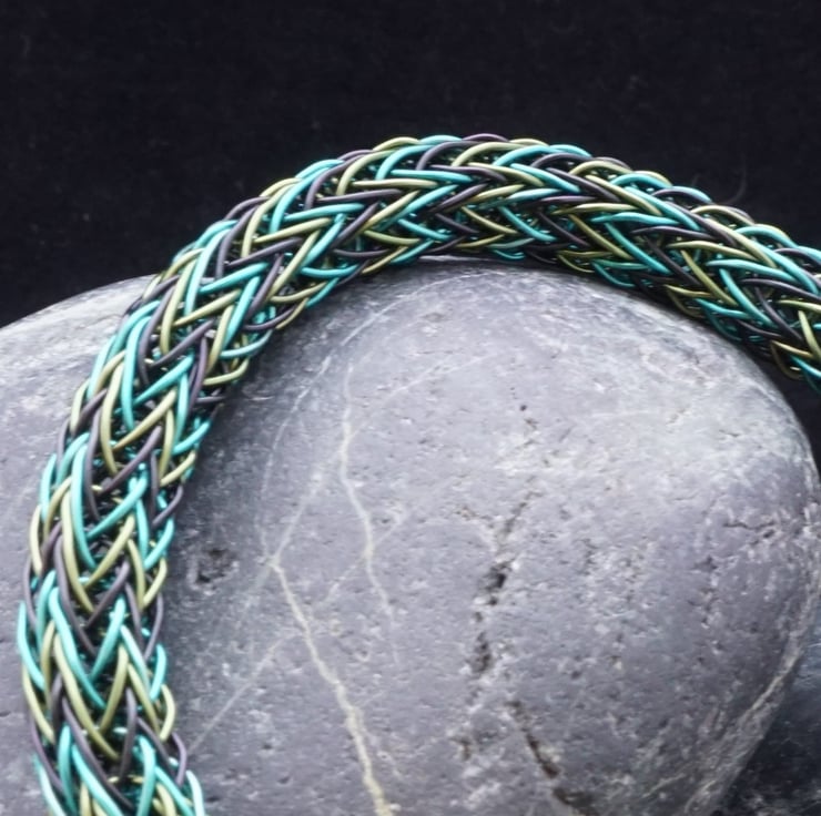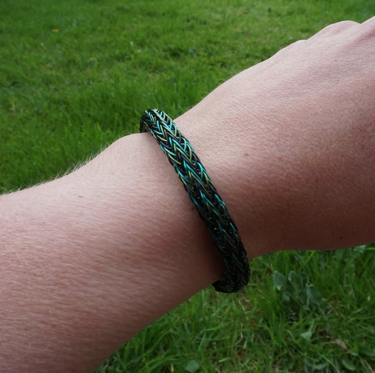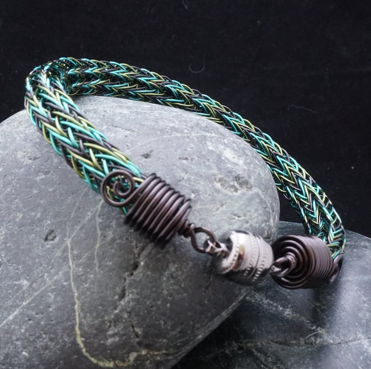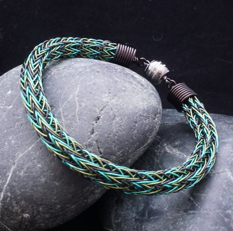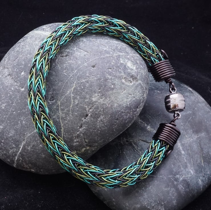 This beautiful bracelet has been made with black, bright green & leaf green plated copper wire using the Viking double knit technique. It's a little trickier using three colours, but it creates a stunning pattern that's worth the extra effort! The ends have been finished with handmade end caps featuring a small spiral detail, & the bracelet fastens really easily with a gunmetal grey coloured magnetic clasp.