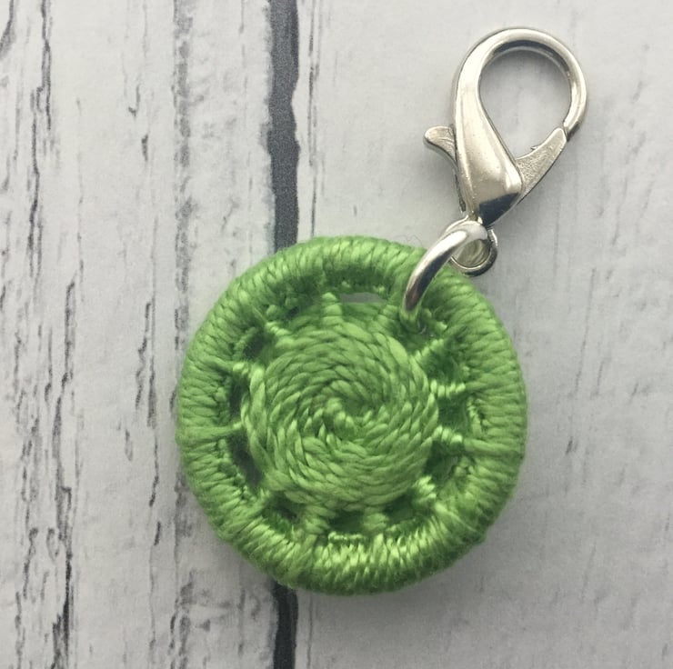 I have made this Dorset button using an emerald green Perle cotton thread on a 25mm brass ring.
