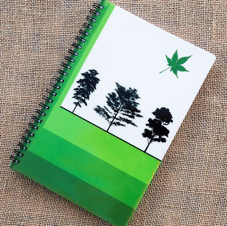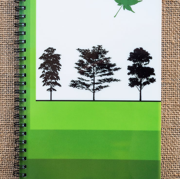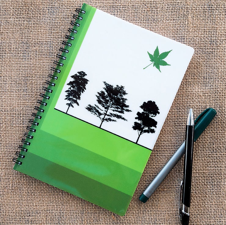 The perfect gift for any nature or countryside lover! A lovely A5 spiral bound notebook with a tree silhouette motif showing three different tree species! Rich green stripes on the wipe clean, durable cover and a maple leaf in one corner complete the design.