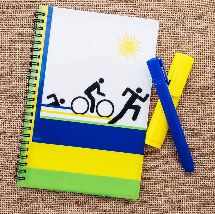 The perfect gift for any triathlon enthusiast! A lovely A5 spiral bound notebook with all three silhouettes depicting the three sports of swimming, cycling and running. Blue, yellow and green stripes on the wipe clean, durable cover and a cheerful yellow sun motif in one corner complete the design.