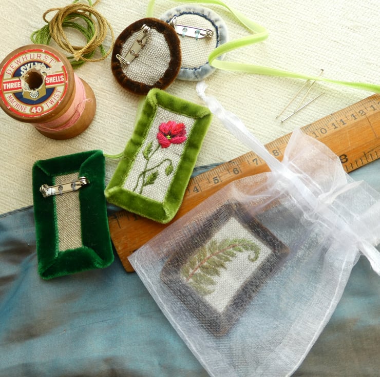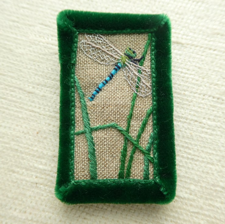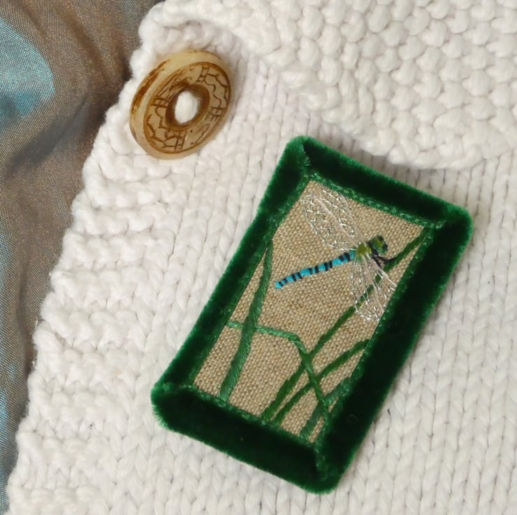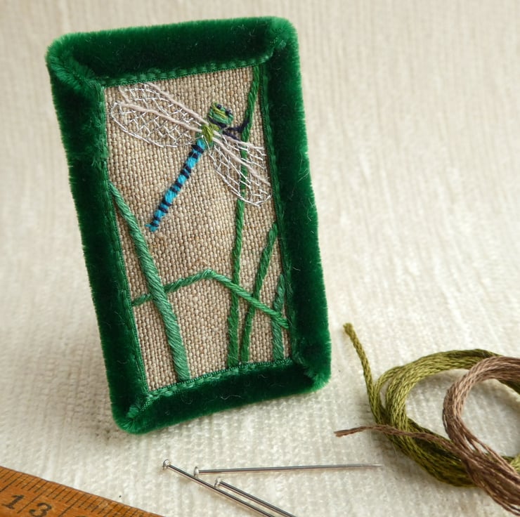 This detailed study of a dragonfly resting on some reeds is stitched by hand onto fabric scraps with embroidery threads, then edged with dark green velvet ribbon to give it structure and a touch of luxury. The wings are stitched with silver thread which catches the light just like real dragonfly wings! There is a brooch back pin with a safety catch on the back to keep it secure. It measures just over 3cm x 5.5cm.