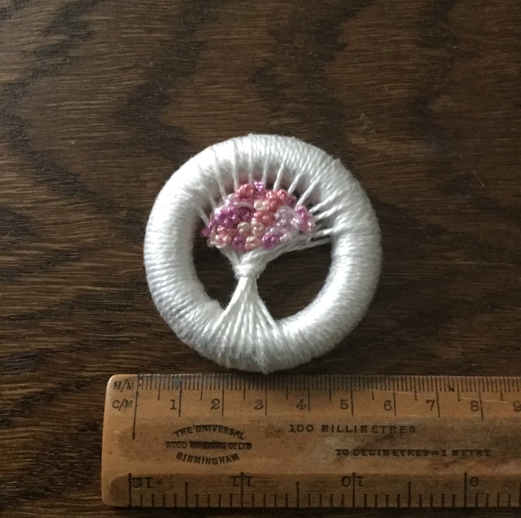 It is worked on a wooden ring and measures 5.5 cm across. The ring is covered in an ivory coloured cotton thread and the posy blossoms are worked in French knots in shades of pink.