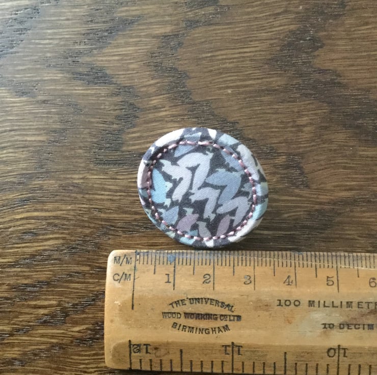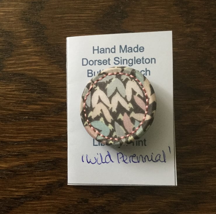 This brooch is made from an early type of traditional Dorset Button known as the Singleton. What makes this brooch special is that the fabric used in its construction is a Liberty print fine cotton lawn in the design ‘Wild Perennial’ with stitched detail worked in toning pink cotton.