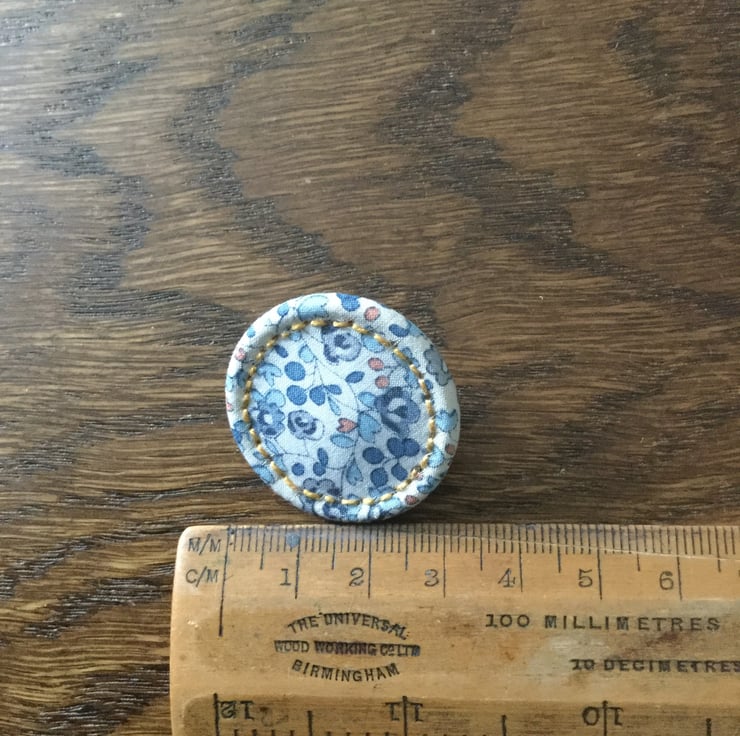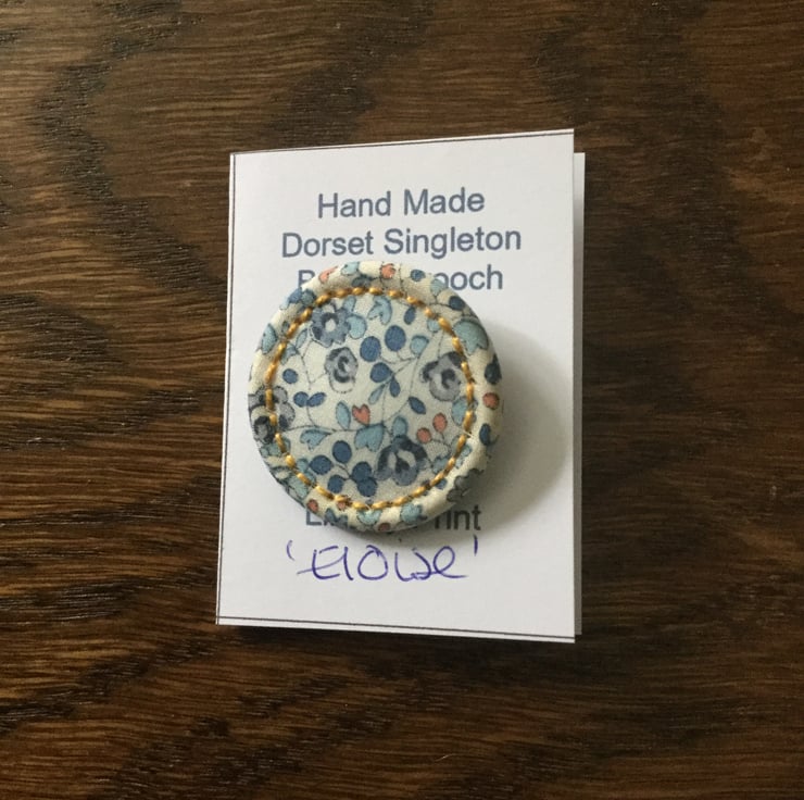 This brooch is made from an early type of traditional Dorset Button known as the Singleton. What makes this brooch special is that the fabric used in its construction is a Liberty print fine cotton lawn in the design ‘Eloise’ with stitched detail worked in toning yellow cotton.