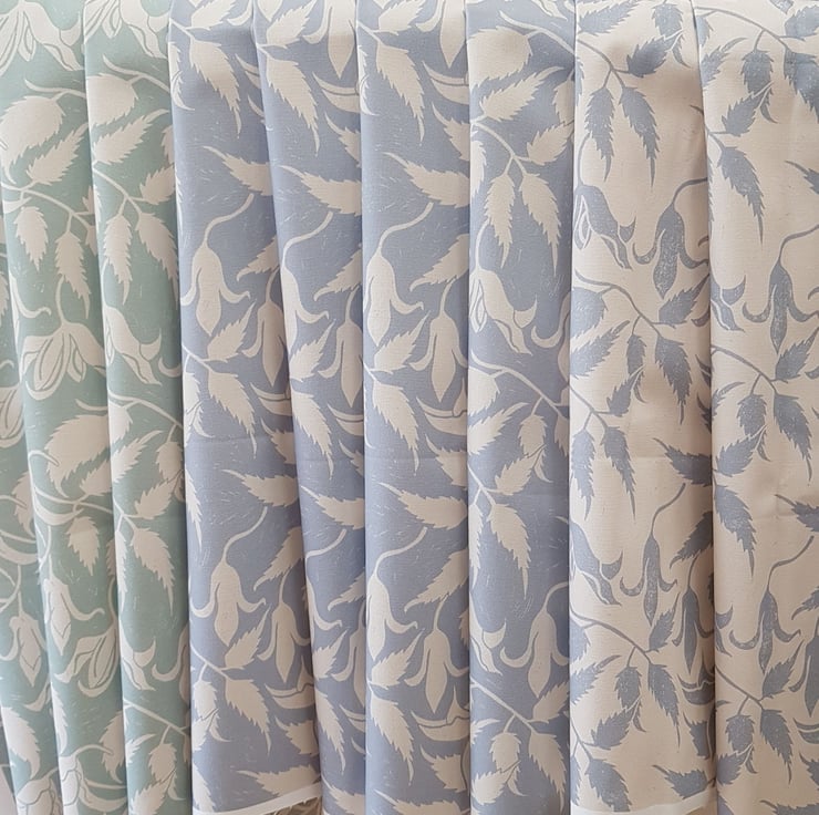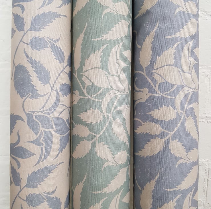'Alpina' is based on my original garden sketches of Clematis Alpina, hand carved in lino and put into repeat before digital printing.