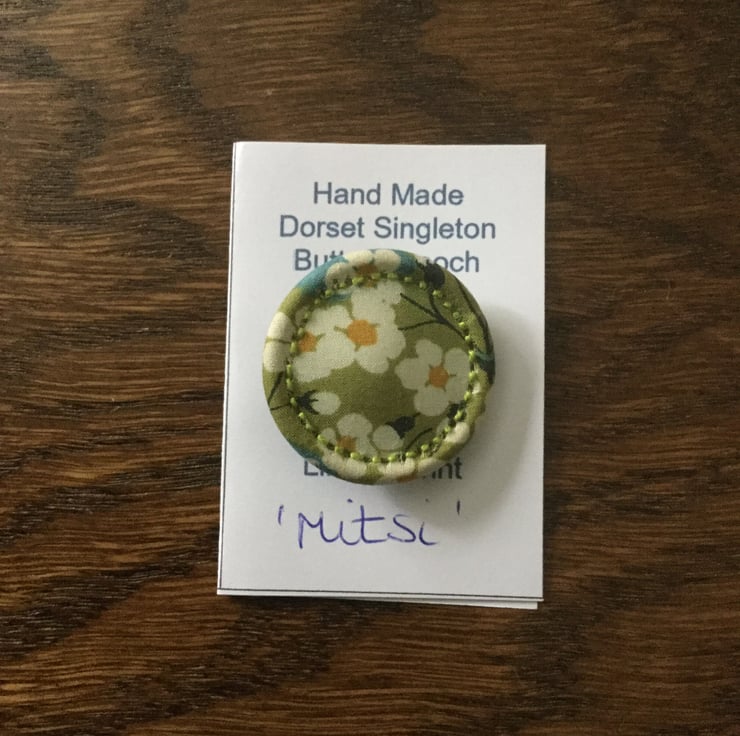This brooch is made from an early type of traditional Dorset Button known as the Singleton. What makes this brooch special is that the fabric used in its construction is a Liberty print fine cotton lawn in the design ‘Mitsi’ with stitched detail worked in toning green cotton.