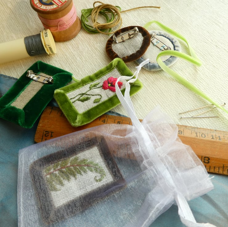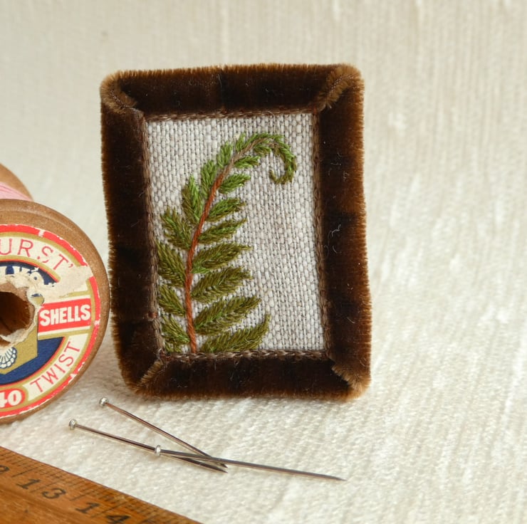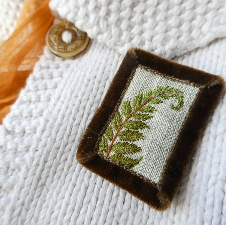 This detailed study of a fern is stitched onto fabric scraps and is reinforced with an edge of velvet ribbon, which also gives the item a luxurious feel. There is a brooch pin with a safety clasp stitched on the back to keep it secure. I've shown it in natural light but remember that screens do vary. It measures 3.5cm x 5cm approx and will be despatched in a small white organza bag.