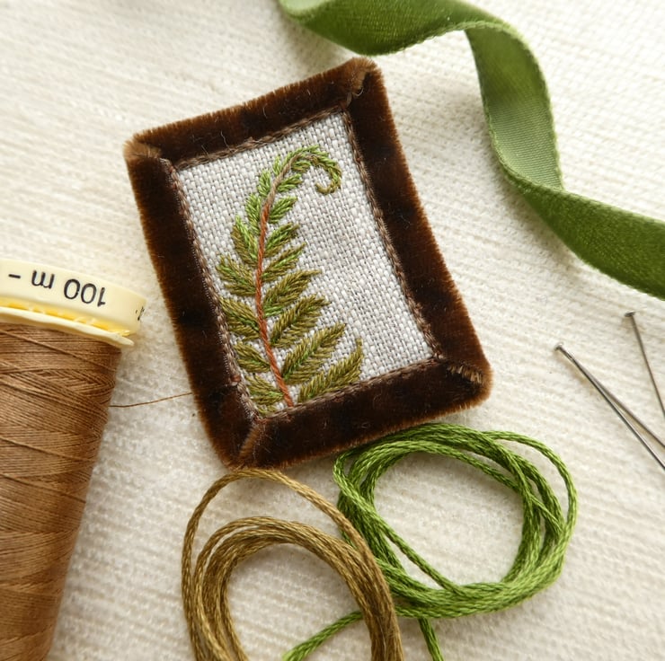 Hand embroidered textile brooch featuring a delicate frond of fern - a little piece of wearable art.